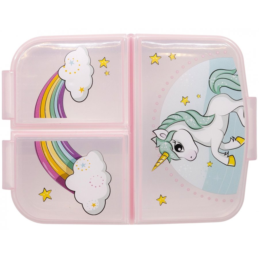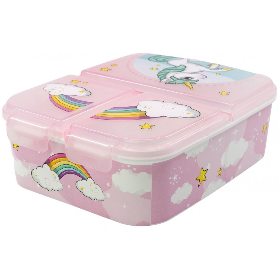 Detský olovrantový multibox s jednorožcom a dúhou. Odolná krabička na desiatu je ideálna do školy, na cesty aj výlety. Veko je čiastočne priehľadné, čo uľahčuje prehľad o obsahu boxu, a je zdobené obrázkami kúzelného jednorožca a dúhy. Táto dóza na jedlo alebo iné drobné predmety je určená pre deti od 3 rokov a nie je vhodná do umývačky riadu ani mikrovlnnej rúry. Je vyrobená zo zdravotne nezávadného materiálu bez obsahu BPA. Na čistenie nepoužívajte abrazíva ani detergenty. Rozmery boxu sú približne 17 x 13,5 x 5,5 cm a jeho hmotnosť je 150 g.