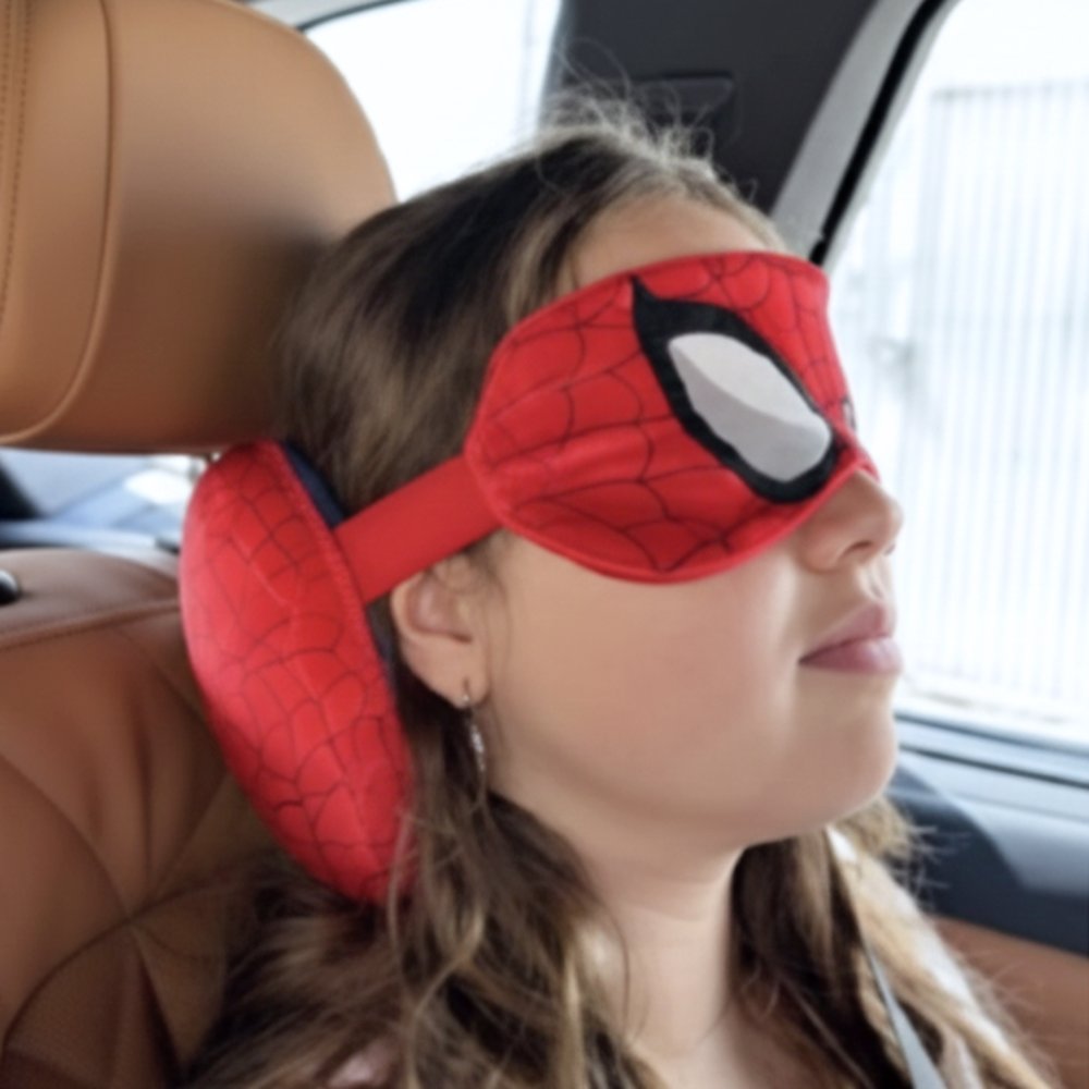 Očná maska s cestovným vankúšikom Spiderman so zapínaním na zips a praktickou karabínkou na zavesenie na batoh. Po rozopnutí sa rozloží a vo vnútri ukrýva očnú masku; po jej nasadení zostane rozložený vankúšik za hlavou a poskytne pohodlie počas cestovania.