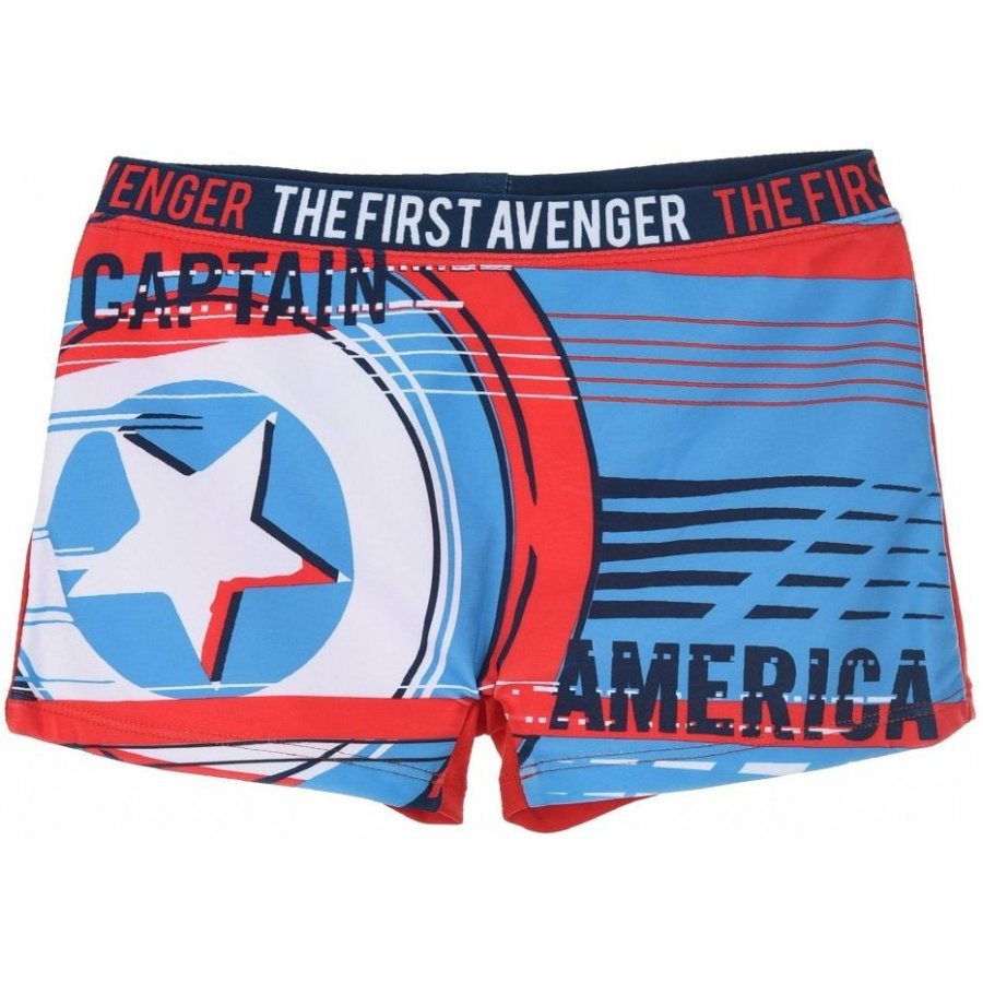 Plavky boxerky pre chlapcov Kapitán Amerika - Prvý Avenger - MARVEL. Prednú stranu plaviek zdobí znak Kapitána Ameriky na čiernom, alebo tyrkysovo modrom podklade - viď. výber farby a veľkosti nižšie. Variant s prevládajúcou čiernou farbou prednej časti má červenú gumu a zadná časť ... Celý text