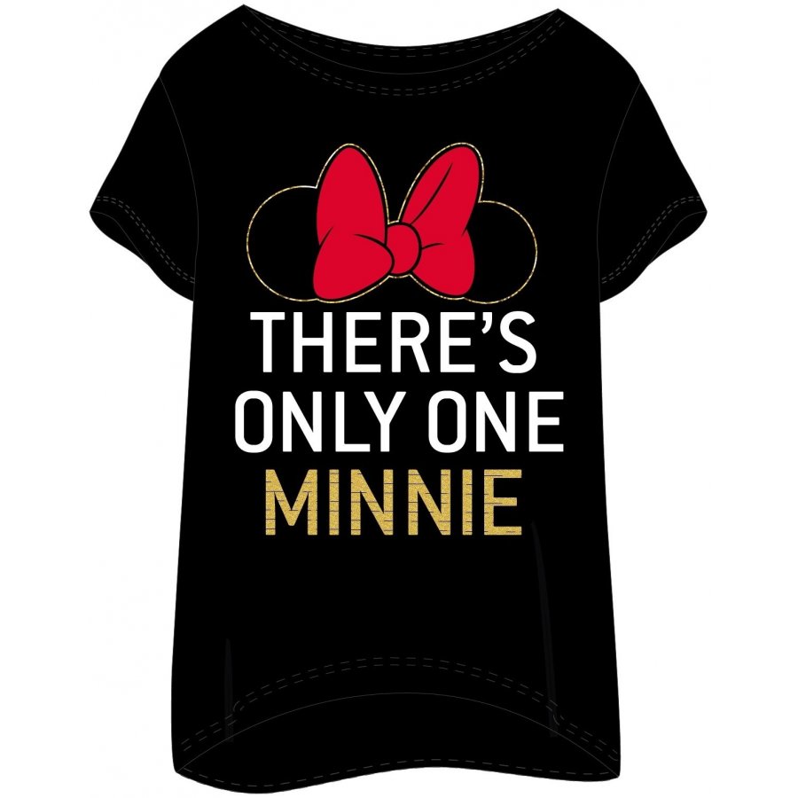 Dámske spacie tričko Disney - motív There 's only one Minnie, čo v preklade znamená Tu je len jedna Minnie! Kontúra okolo mašle a nápis MINNIE sú zlaté a trblietavé. Ponúkame čiernu variantu, ktorá je vyrobená zo 100% bavlny a sivo melírované variantu, ktorá je vyrobená z 98% bavlny a 2% polyesteru z dôvodu melírovania - viď výber farby a veľkosti nižšie.