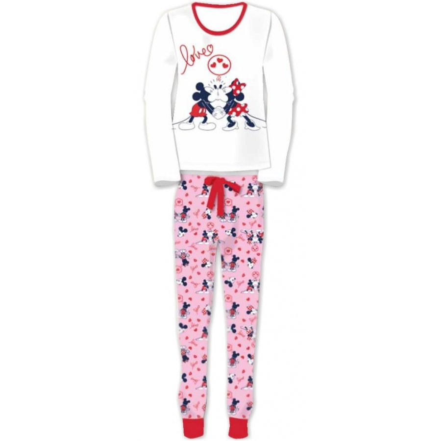 Pyžamo pre dievčatá a ženy Minnie Mouse - Disney - s dlhými rukávmi a nohavicami ukončenými úpletom. Toto pyžamo je vyrobené zo 100% bavlny. Prednú stranu horného dielu zdobí obrázok legendárneho zamilovaného páru myšky Minnie a myšiaka Mickyho. Rovnaký motív ale drobnejšej veľkosti sa opakuje na nohaviciach. Toto pyžamo ponúkame vo variante s bielym horným dielom s ružovými nohavicami, alebo s ružovým horným dielom s červenými nohavicami - viď výber veľkosti a farby nižšie.