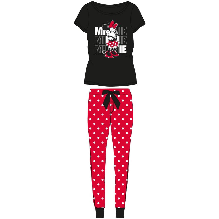 Bavlnené dámske pyžamo Minnie Mouse - Disney - s krátkym rukávom a dlhými nohavicami. Prednú stranu horného dielu zdobí obrázok legendárnej myšky Minnie a trikrát nápis s jej menom MINNIE. Nohavice sú bodkované v páse ozdobené mašľou. Toto dámske pyžamo ponúkame vo veľkostiach S, M, L a XL av čierno / bielom, alebo čierno / červenom prevedení - viď výber veľkosti a farby.