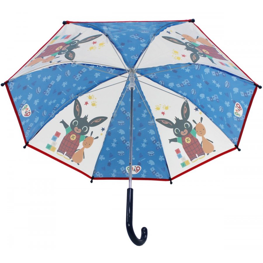 Chlapčenský dáždnik Zajačik Bing. Konštrukcia dáždnika je kovová, spodná rukoväť je plastová s príjemne hladkým povrchom. Priemer roztvoreného dáždnika je cca 69 cm, dĺžka zatvoreného dáždnika je cca 61 cm. Vďaka priehľadnej fólii každého druhého panelu sa dá s týmto dáždnikom dobre orientovať v priestore aj v daždi.