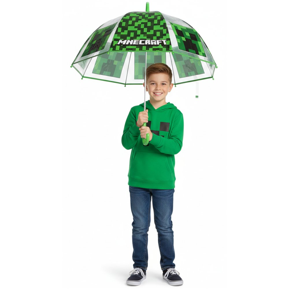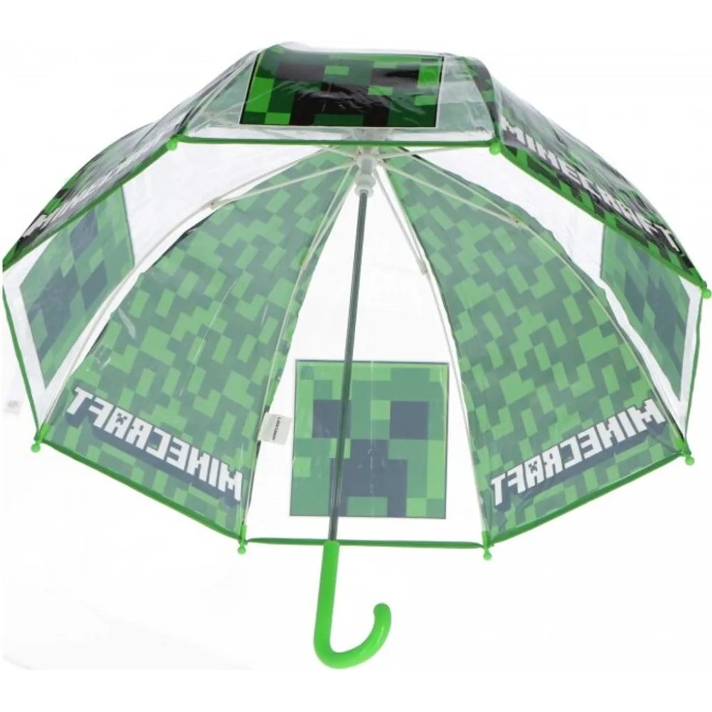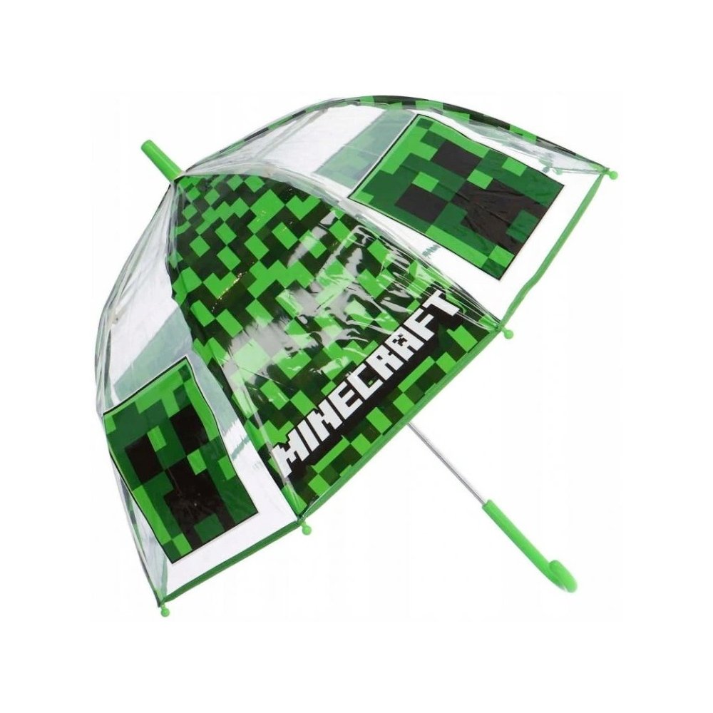 Detský dáždnik Minecraft s obľúbeným motívom Creepera v zeleno-čiernom dizajne. Vďaka priehľadnej ploche je možné sa pri chôdzi ľahšie orientovať v priestore. V rozloženom stave má priemer 67 cm, po zatvorení meria 69 cm. Spevnený lem dáždniku dodáva väčšiu odolnosť.
