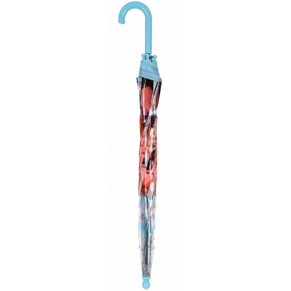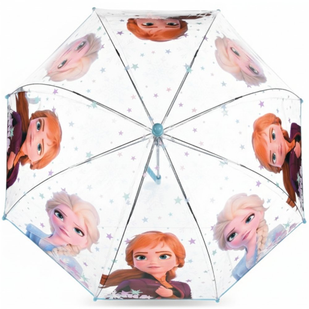 Detský priehľadný dáždnik s motívom Frozen. Kovová konštrukcia, poťah z odolného materiálu POE, plastová rukoväť s hladkým povrchom prispôsobená pre malé ruky. Priemer rozprestretého dáždnika je cca 70 cm.
