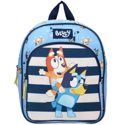 Detský batôžtek Bluey s obrázkom malej fenky Bluey a jej sestry Bingo na pruhovanom podklade. Má ...