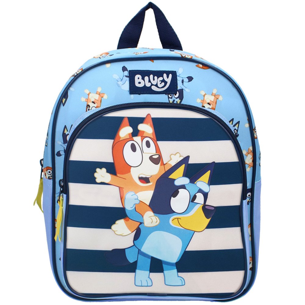 Detský batôžtek Bluey s obrázkom malej fenky Bluey a jej sestry Bingo na pruhovanom podklade. Má jednu hlavnú priehradku, priestranné predné vrecko na zips, nastaviteľné polstrované popruhy a uško na nosenie v ruke alebo zavesenie. Rozmery cca 30 x 25 x 11 cm.