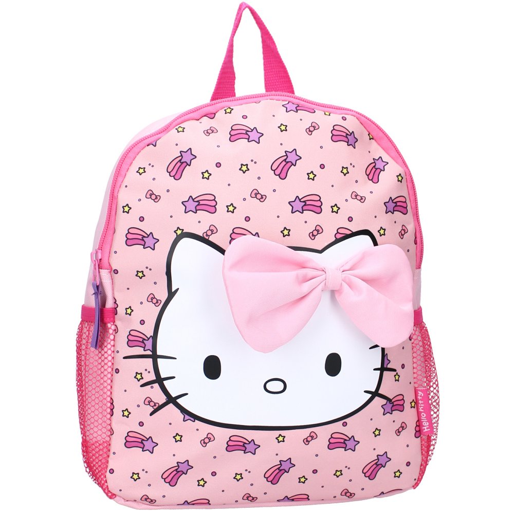Detský batôžtek Hello Kitty s plastickou mašľou. Priestranná priehradka na zips, dve bočné pružné sieťky na nápoj alebo iné drobnosti, nastaviteľné polstrované popruhy, uško na nosenie v ruke alebo zavesenie a hravý dizajn s hviezdičkami a mašľami. Rozmery cca 31 x 25 x 10 cm, objem 7,75l.