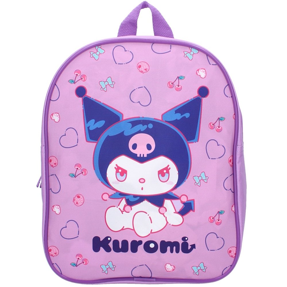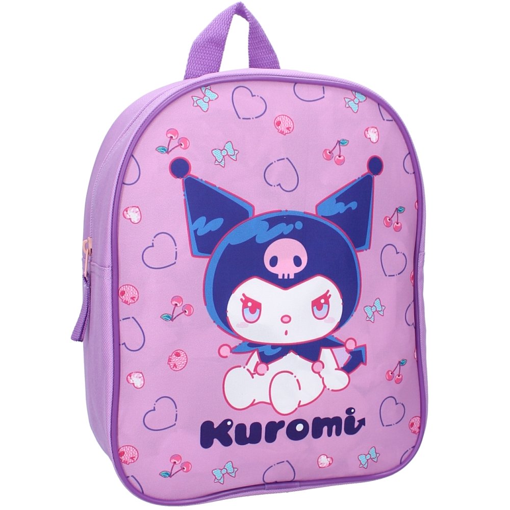 Malý detský batoh Kuromi s roztomilým obrázkom obľúbenej postavičky v kawaii štýle od spoločnosti Sanrio. Hlavný priestor má zapínanie na zips a rozmer cca 29 x 22 x 9 cm. Nechýbajú ani nastaviteľné popruhy s výstelkou a praktické uško na zavesenie.