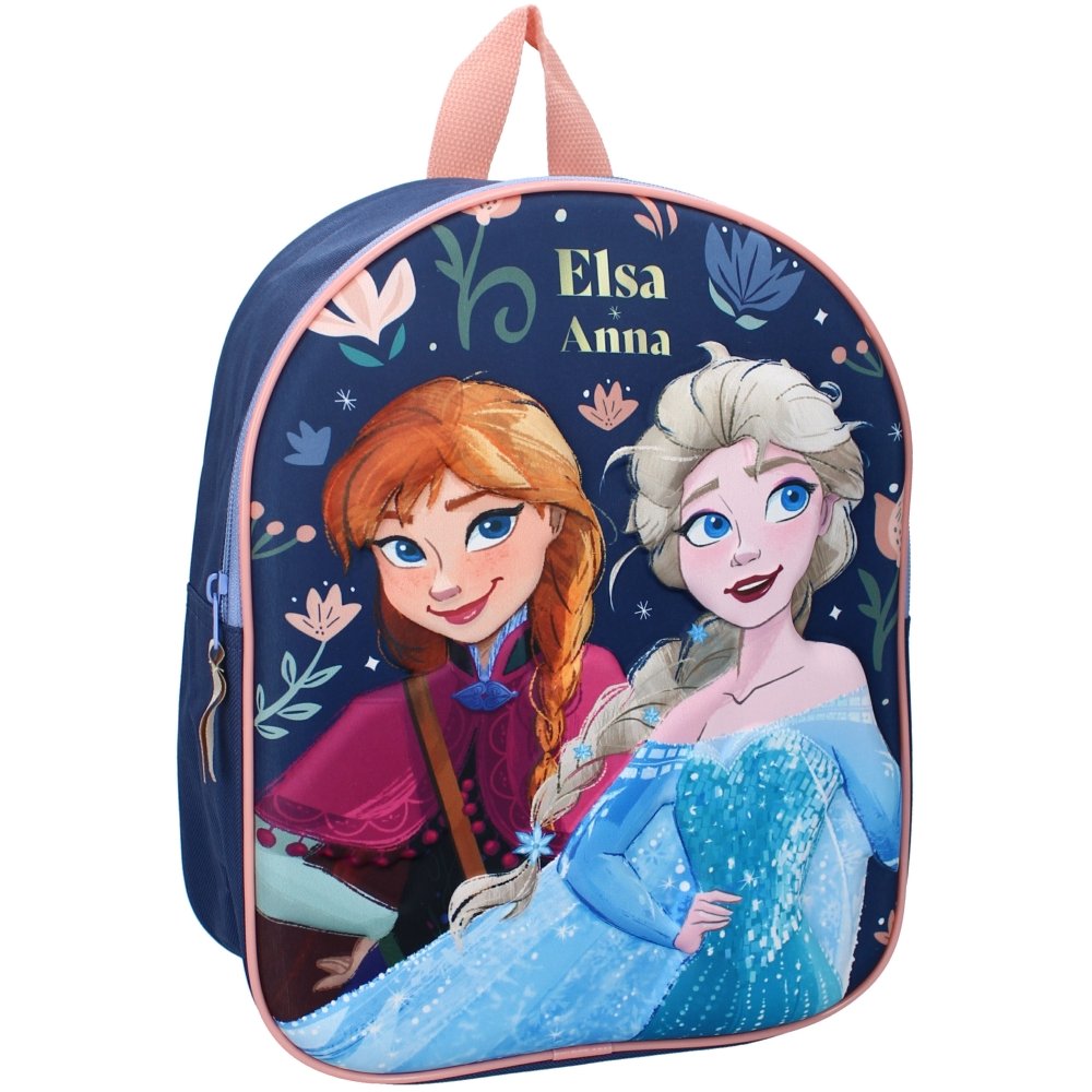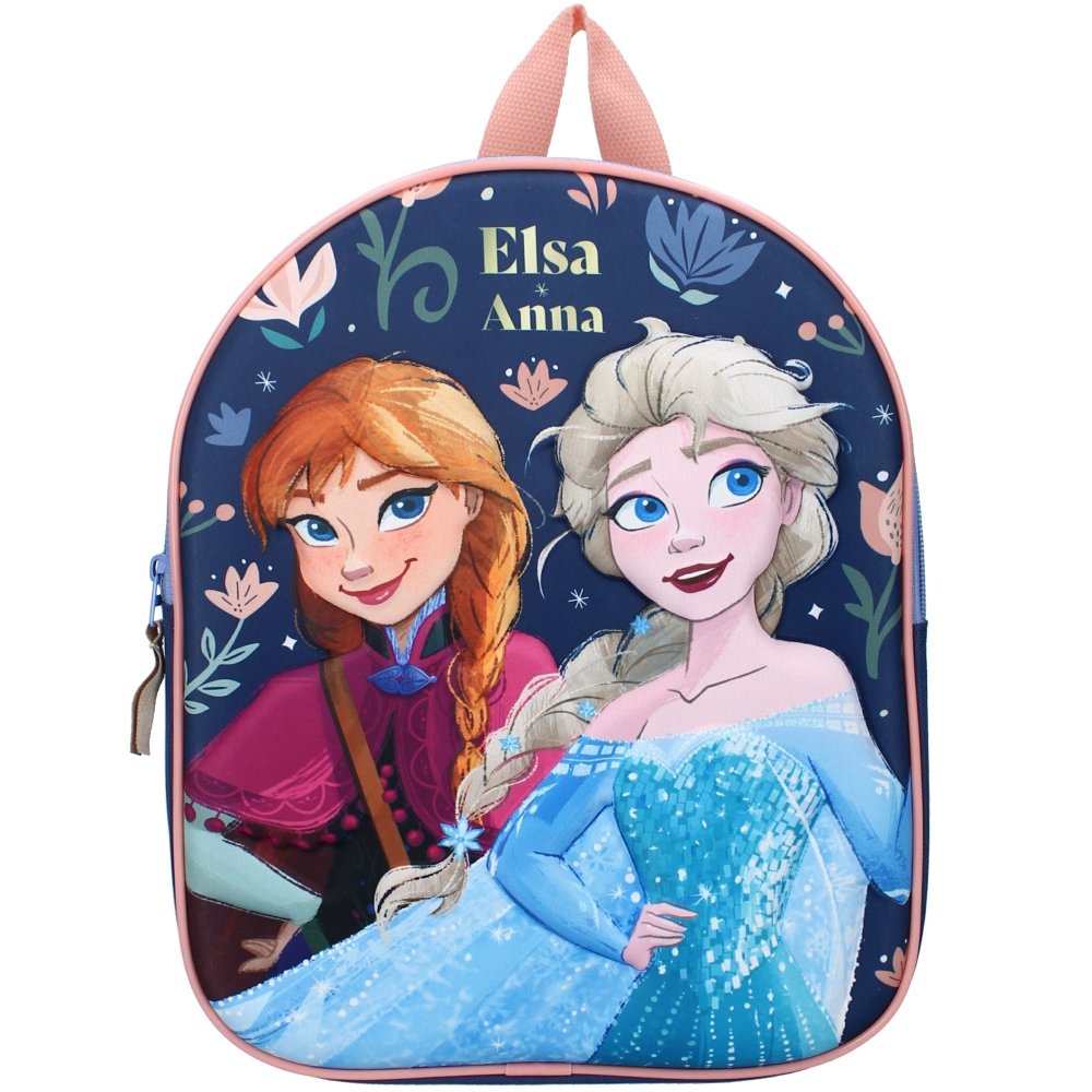 Detský batôžtek Ľadové kráľovstvo - Frozen - s plastickým 3D obrázkom Elsy a Anny. Má jednu priestrannú priehradku na zips, nastaviteľné polstrované popruhy na chrbát a praktické pútko na nosenie v ruke alebo zavesenie. Rozmery 32 × 26 × 11 cm, objem 9,15 l.