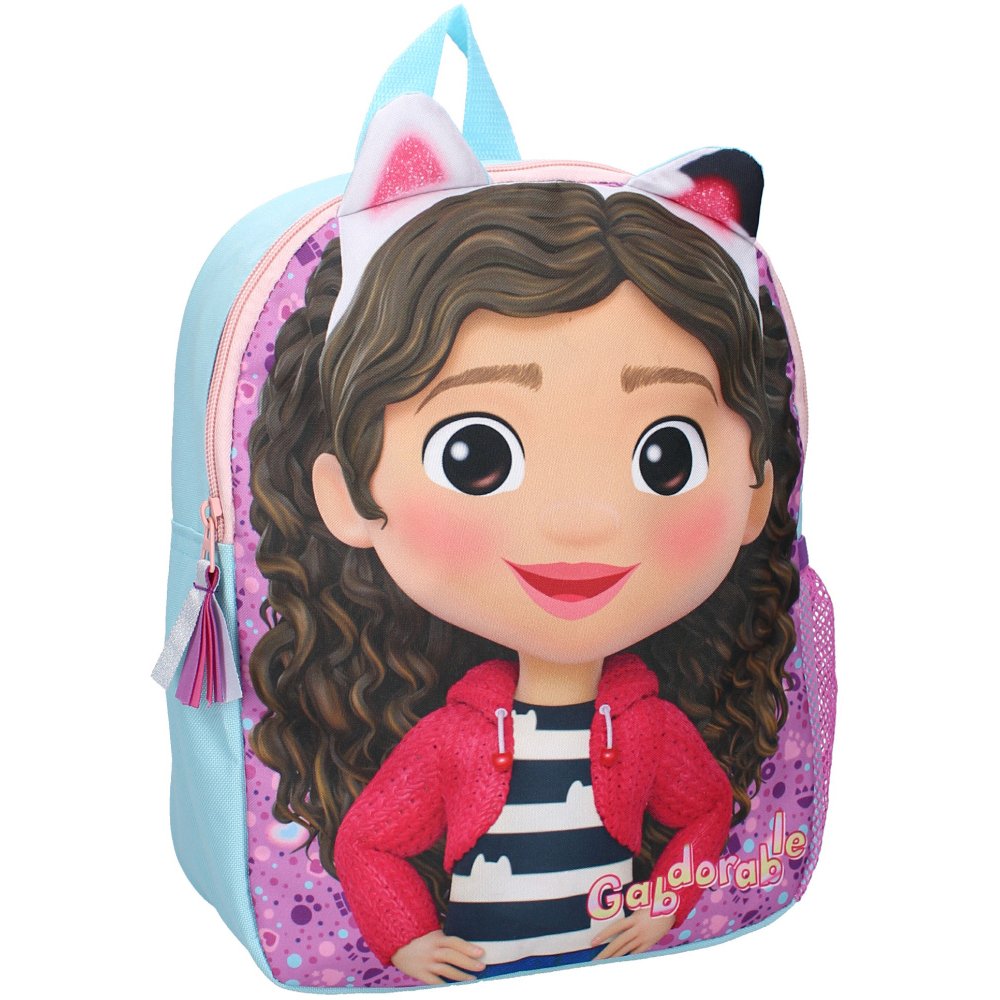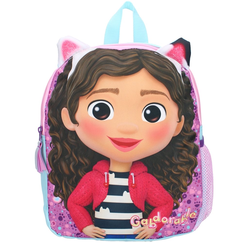 Malý detský batoh Gábinin kúzelný domček – motív Gábinka s mačacími uškami. Hlavný priestor má zapínanie na zips a rozmer cca 32 × 26 × 11 cm. Nechýba ani bočná sieťka na nápoj, nastaviteľné popruhy s výstelkou a praktické ucho na zavesenie.