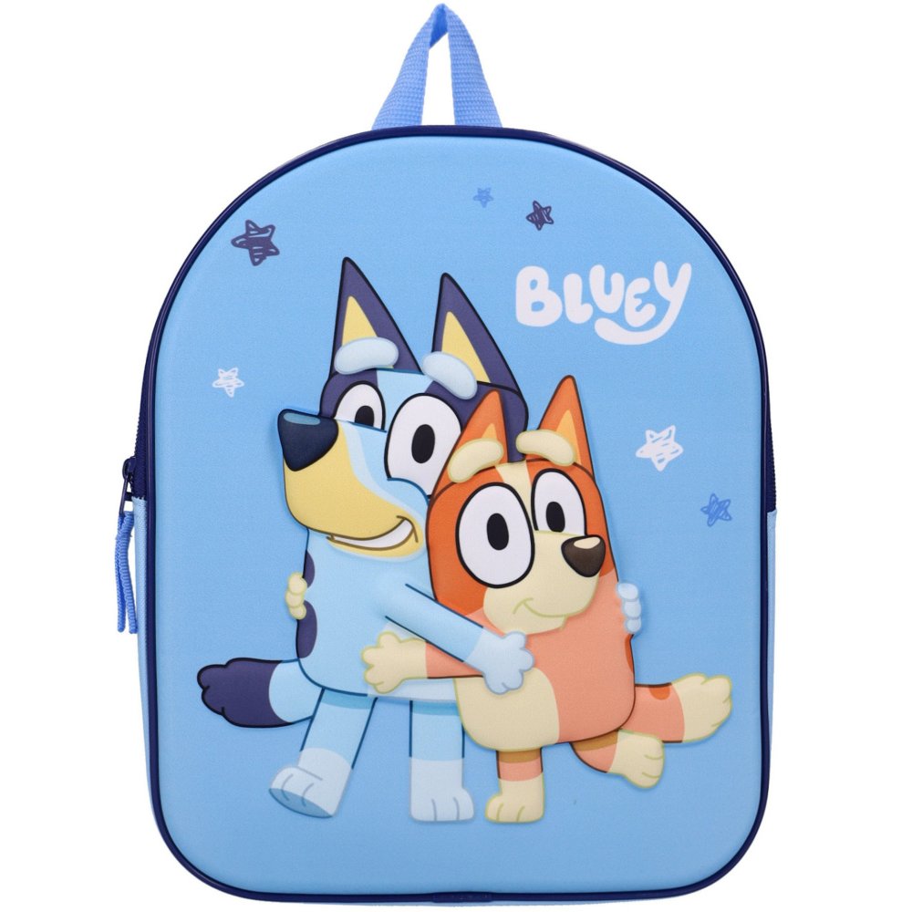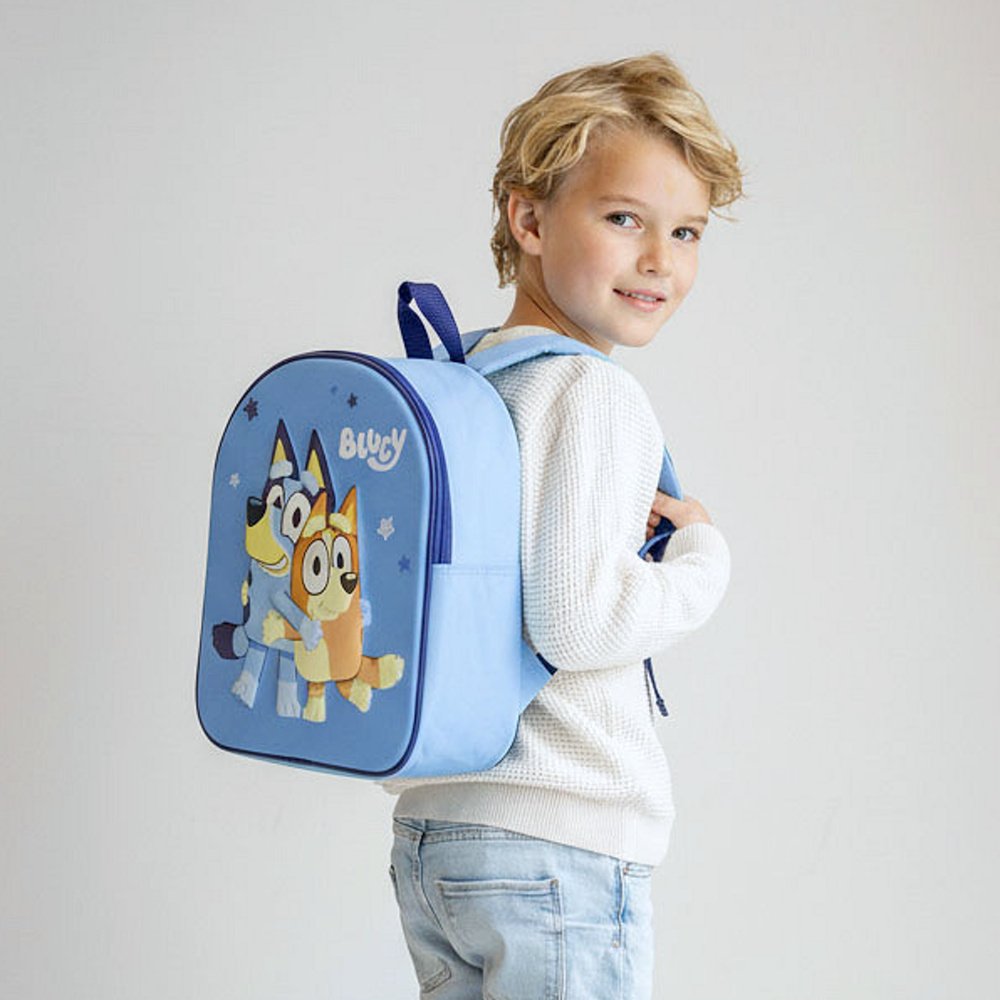 Detský batôžtek Bluey s plastickým 3D obrázkom sestričiek Bluey a Bingo. Má jednu priestrannú priehradku na zips, nastaviteľné polstrované popruhy na chrbát a praktické pútko na nosenie v ruke alebo zavesenie. Rozmery 32 × 26 × 11 cm, objem 9,15 l.