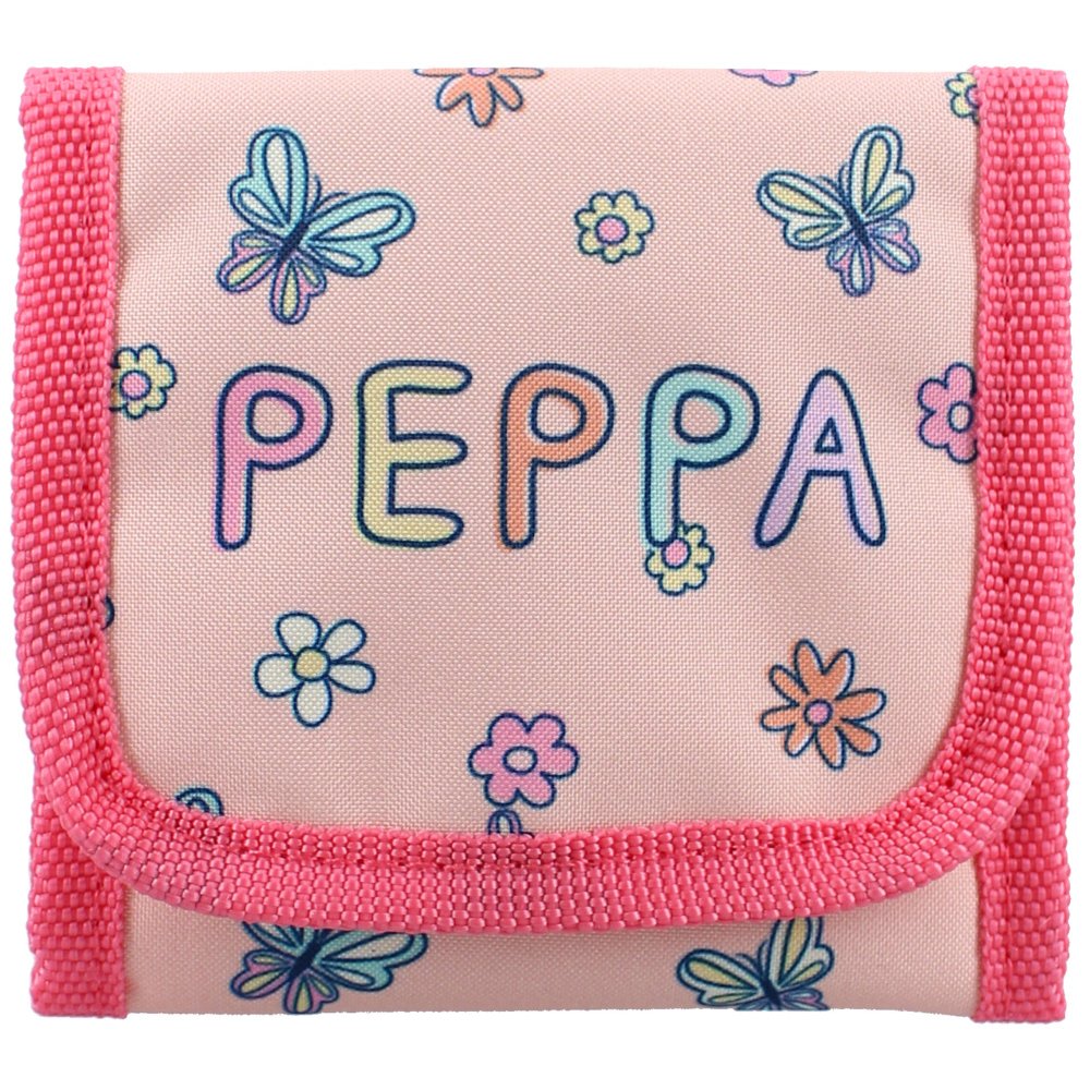 Detská textilná peňaženka Prasiatko Peppa v ružovej farbe s motívom Pepinky, kvietkov a motýlikov. Uzatvára sa na suchý zips, má priehradku na bankovky a vrecko na mince.