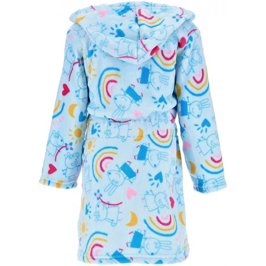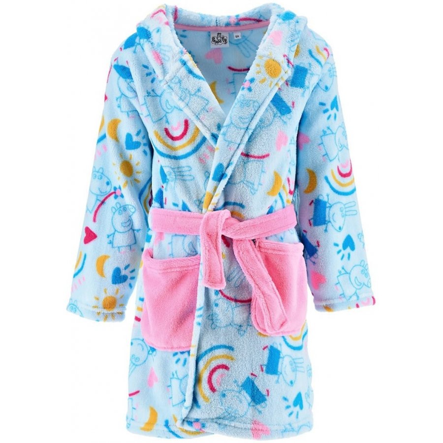 Dievčenský župan s kapucňou Prasiatko Peppa. Tento detský župan je vyrobený z príjemne jemného a hrejivého zamatového coral fleece WellSoft 190 g/m² s obrázkami prasiatka Pepiny a ich kamarátov, srdiečok, slnieček a dúhy. Župan má kapucňu, dve výrazne farebné vrecká a samozrejme opasok v páse.