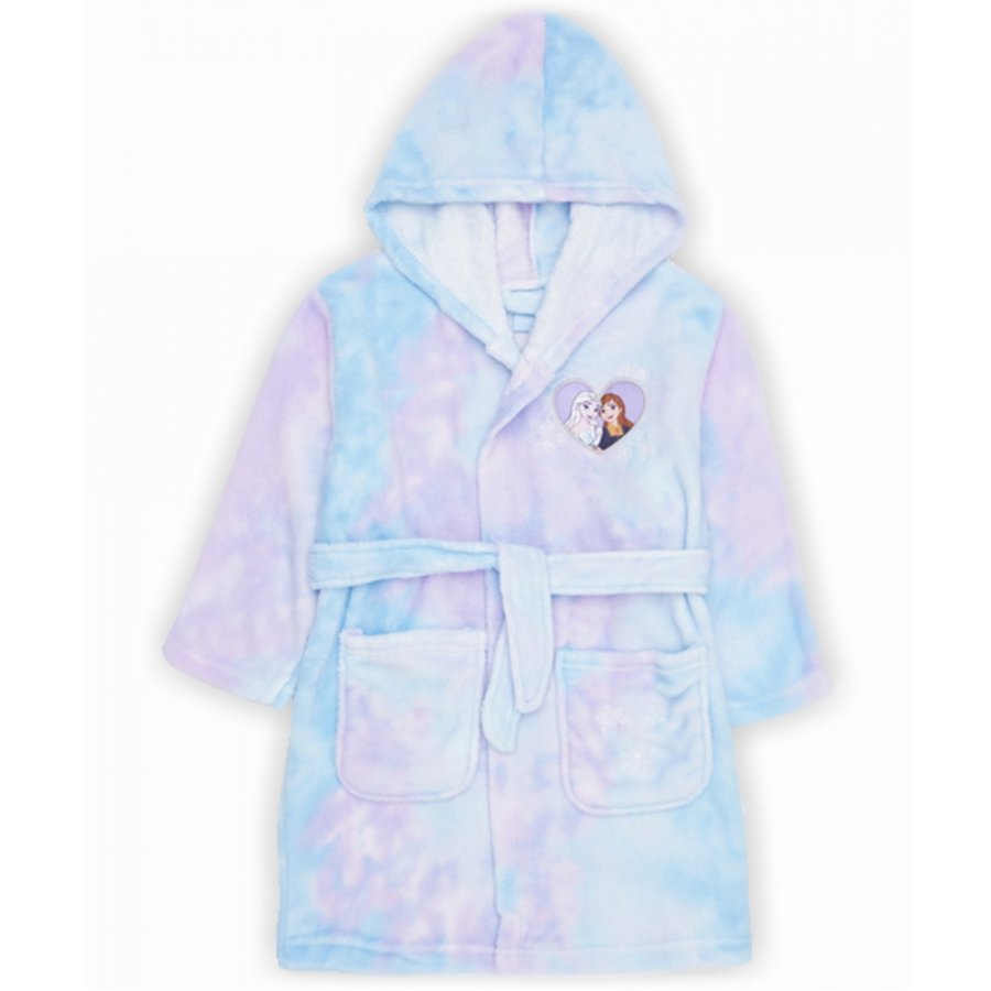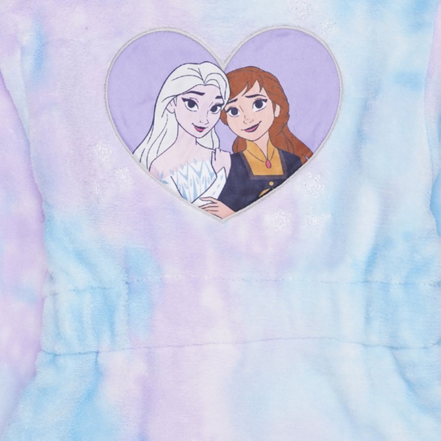 Detský župan Frozen s obrázkom princezien Anny a Elsy. Je vyrobený z jemného a hrejivého pestrofarebného Coral fleece. Disponuje praktickou kapucňou, srdiečkami s portrétom princezien na prsiach aj na chrbte, dvoma vreckami a opaskom v páse. Ideálna voľba pre malé fanúšičky priateľov z Ľadového kráľovstva.