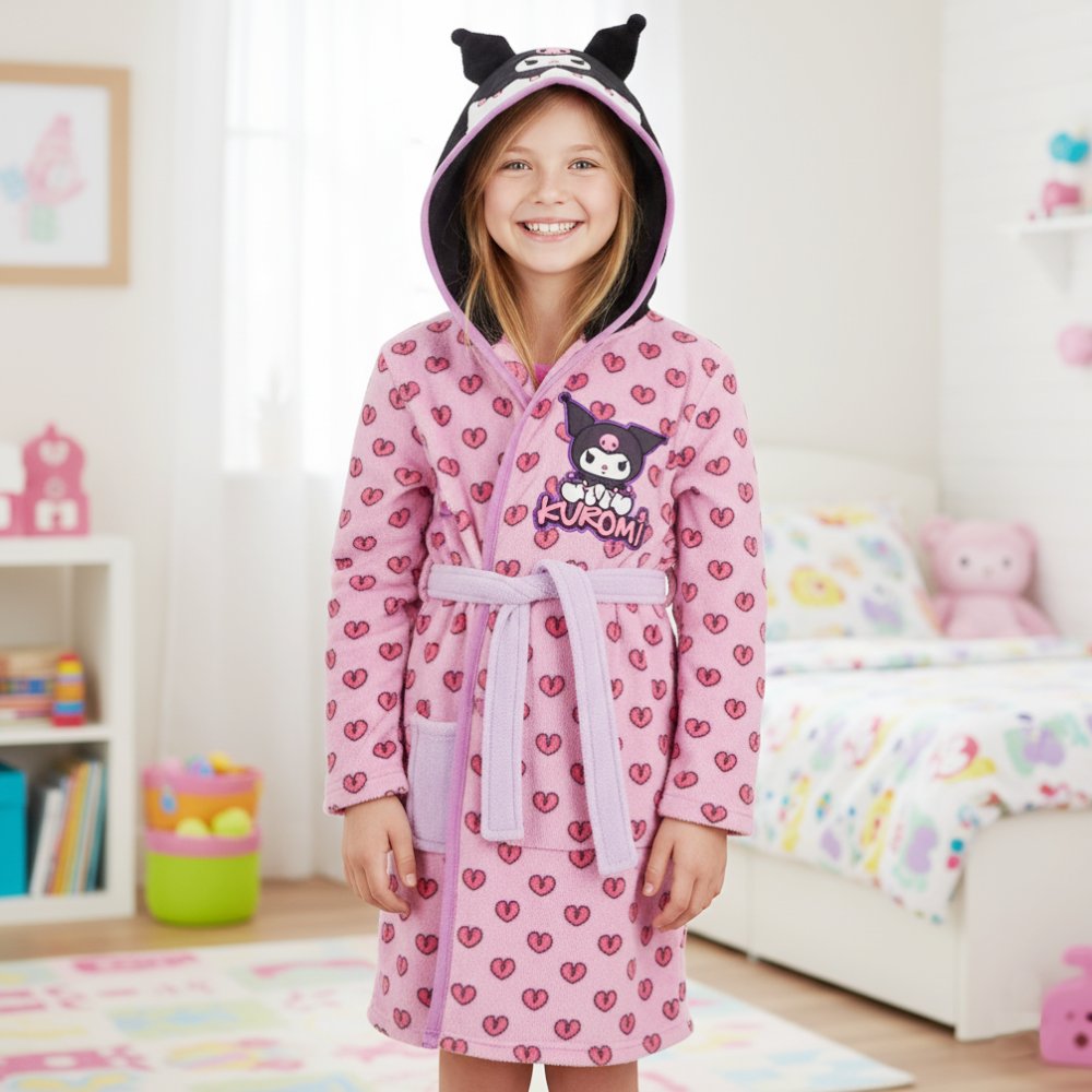 Detský župan Kuromi s roztomilým motívom obľúbenej postavičky zo sveta Sanrio. Je vyrobený z mäkkého flísu s jemným krátkym chĺpkom, ktorý je príjemný na dotyk. Má kapucňu s uškami, jedno vrecko a opasok na viazanie. Dostupný vo veľkostiach 98–140, teda pre dievčatá približne od 3 do 10 rokov.