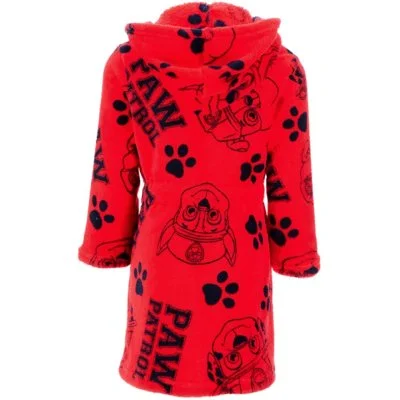 Červený detský župan Paw Patrol s obrázkami obľúbených záchranárov Chasea, Marshalla a Rubbleho. ...