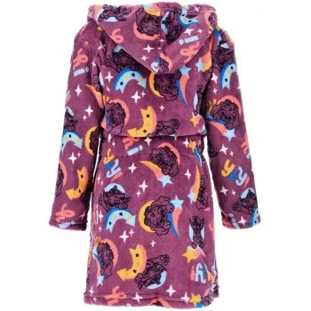 Detský župan Labková patrola s portrétmi pilotky Skye, odtlačkami labiek, hviezdičkami a symbolmi vrtúľ. Má kapucňu, dve vrecká a opasok v páse. Vyrobený z mimoriadne hebkého materiálu WellSoft. Dostupný vo veľkostiach 98, 104, 110 a 116.