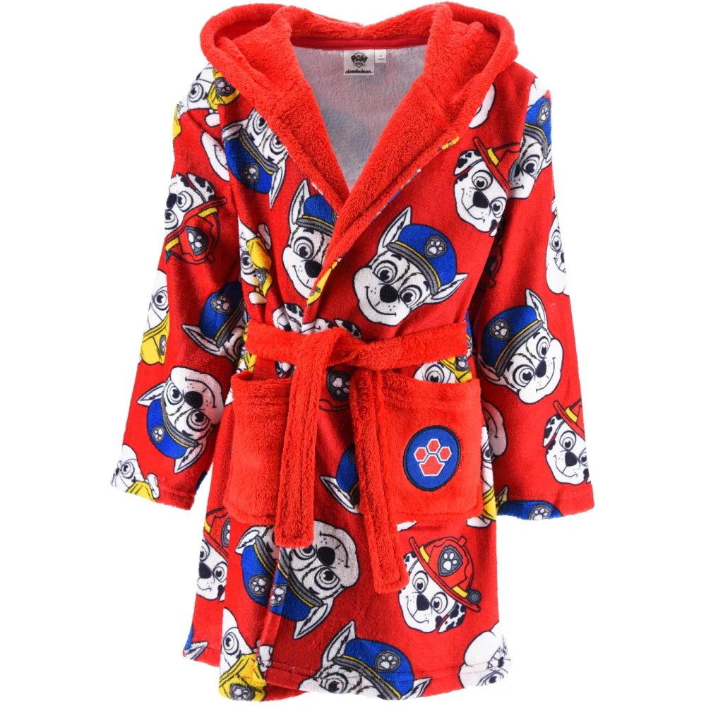 Červený detský župan Paw Patrol s obrázkami obľúbených záchranárov Chasea, Marshalla a Rubbleho. Má kapucňu, dve vrecká a opasok v páse. Vyrobený z mimoriadne hebkého materiálu WellSoft. Dostupný vo veľkostiach 98, 104, 110 a 116.
