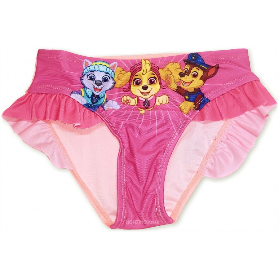Detské plavkové nohavičky Tlapková patrola - Paw Patrol - s obrázkom "labiek" Everest, Skye a Chase. V páse a v leme nohavíc majú gumu. Materiál plaviek je pomerne elastický, takže sa dobre prispôsobí telu a preto sa ľahko obliekajú a pohodlne sa nosí. Tieto plavky ponúkame vo veľkostiach 98, 104, 110, 116, 122 a 128 a v prevedení s ružovými volánikmi a broskyňovo oranžovou zadnou časťou, alebo s broskyňovo oranžovými volánikmi a ružovou zadnou časťou - viď výber veľkosti a farby.