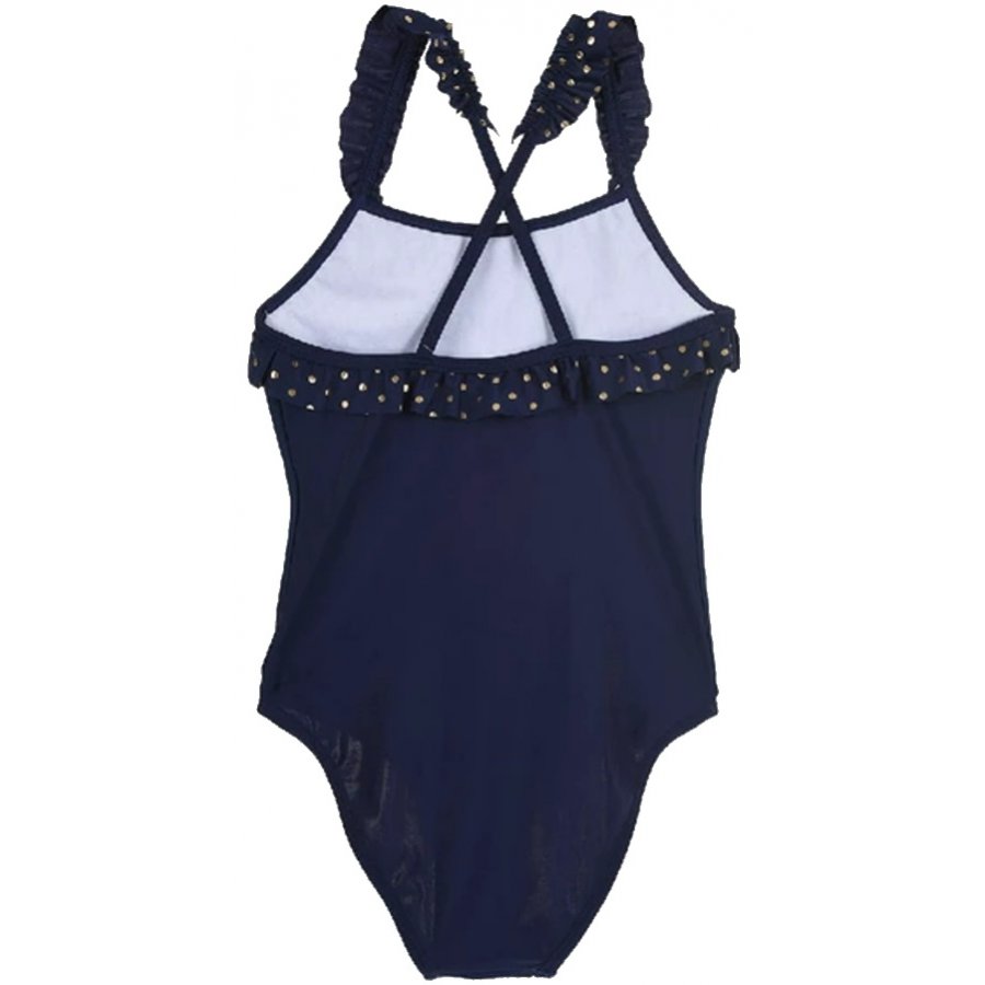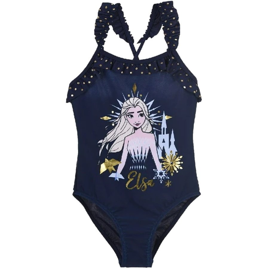 Dievčenské jednodielne plavky Ľadové kráľovstvo - Frozen. Zdobí ich obrázok princeznej Elsy so zlatými doplnkami okolo nej a volánikmi so zlatými bodkami okolo horných lemov. Nahusto nariasené volániky zdobia aj ramienka. Z vnútornej strany spodnej časti je jemná biela podšívka. Materiál plaviek je pomerne elastický, takže sa dobre prispôsobí telu, ľahko sa obliekajú a pohodlne sa nosia. Tieto plavky ponúkame vo svetlo modrej alebo tmavo modrej (navy) variante - viď výber farby a veľkosti.