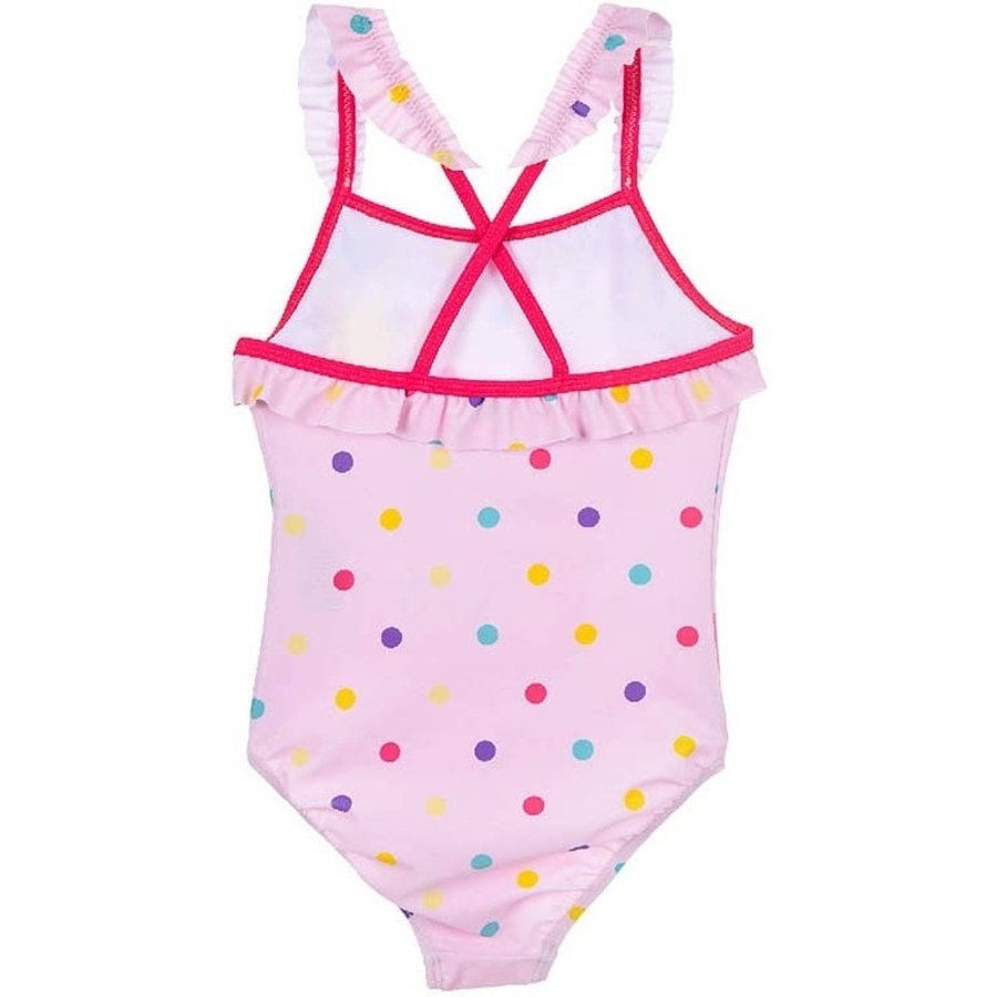 Detské jednodielne plavky Prasiatko Peppa s bodkami. Dievčenské plavky s obrázkom prasiatka Peppiny, ktorá si užíva slnečný deň vo vode na nafukovacom jednorožcovi. Horný lom a ramienka sú zdobené nariaseným volánikom. Materiál plaviek je pomerne elastický, takže sa dobre prispôsobí telu, ľahko sa obliekajú a pohodlne sa nosia. Tieto dievčenské plavky Prasiatko Peppa dodávame v ružovej, alebo tyrkysovej farbe - viď. výber veľkosti a farby.