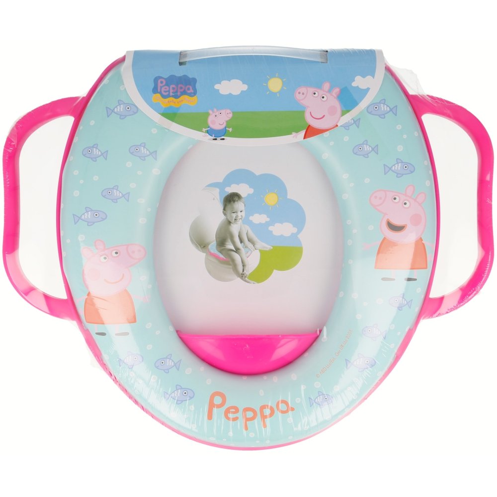 Mäkká WC redukcia Peppa Pig s madlami pomáha deťom od 10 mesiacov pri prechode z nočníka na toaletu. Ponúka pohodlné sedenie, bezpečný úchop a jednoduché čistenie. Pasuje na väčšinu štandardných WC sedadiel.