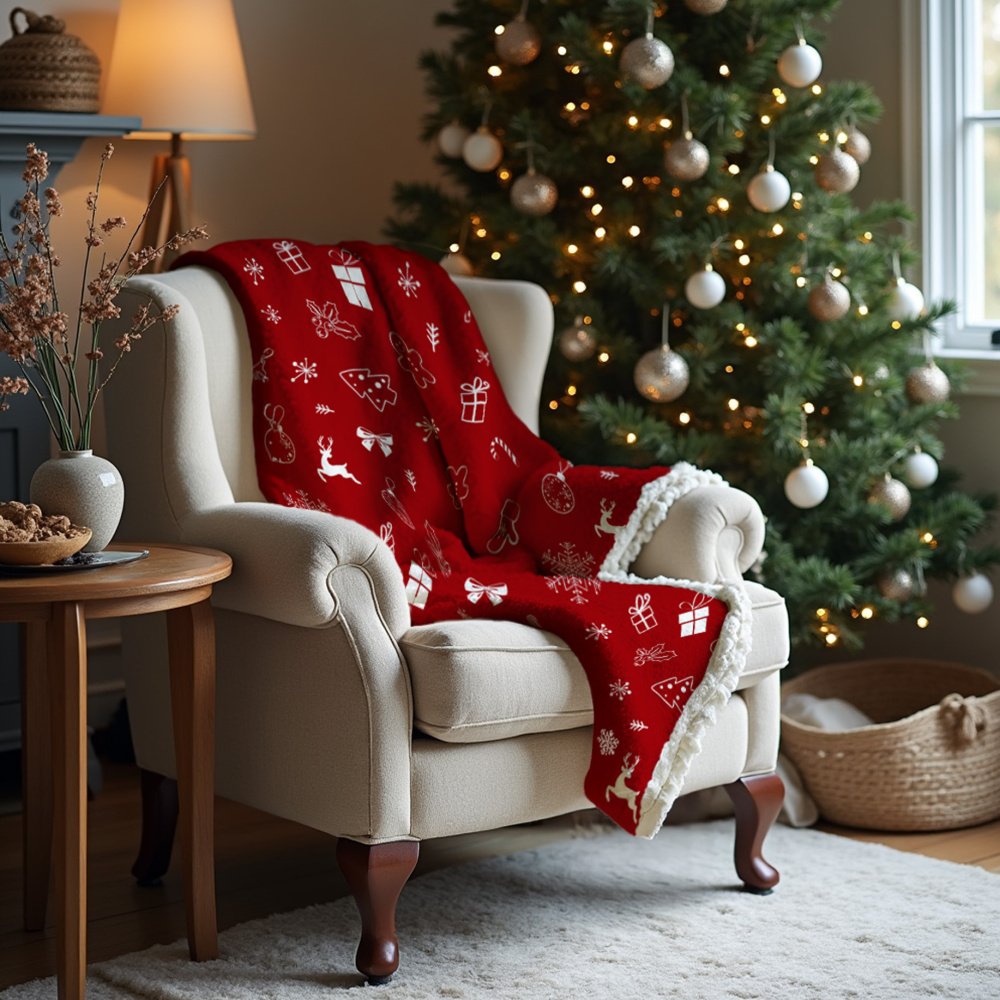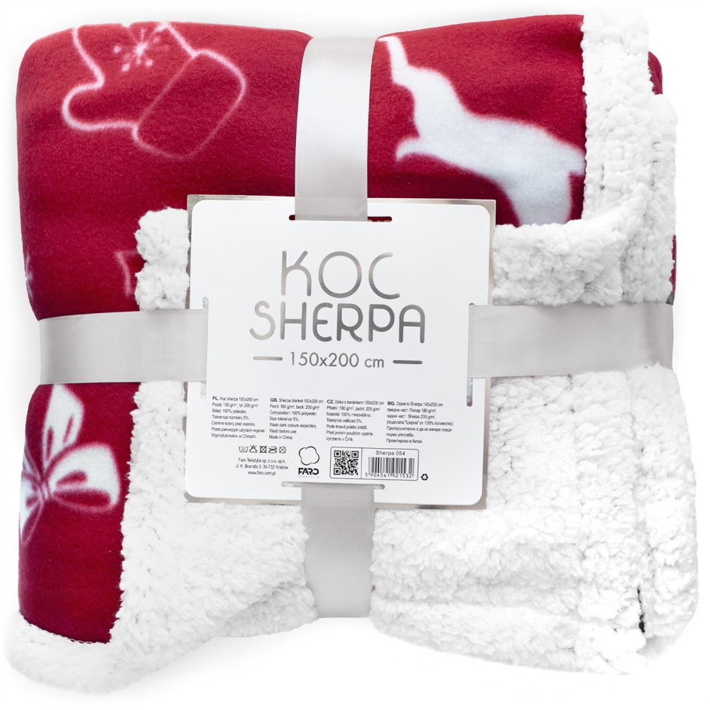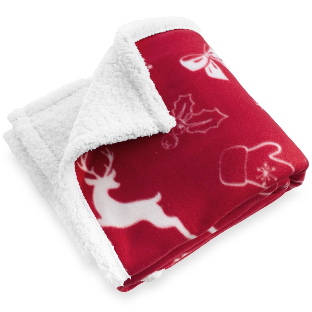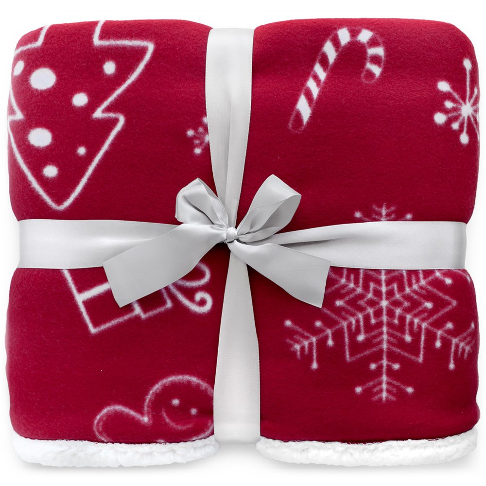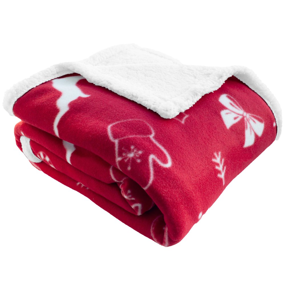 Vianočná deka s bielou potlačou stromčekov, darčekov, baniek, perníčkov a sobov na sýto červenom podklade. Z jednej strany hebký materiál, z druhej huňatý povrch pripomínajúci barančiu kožu. Ideálna na zimné večery aj ako vianočné dekorácie. Zabalená s elegantnou darčekovou mašľou. Rozmer 150 x 200 cm.