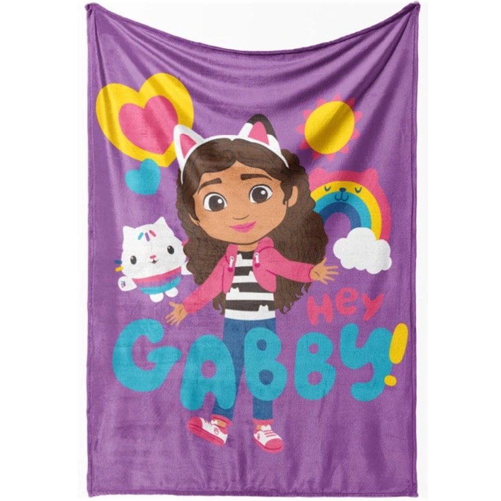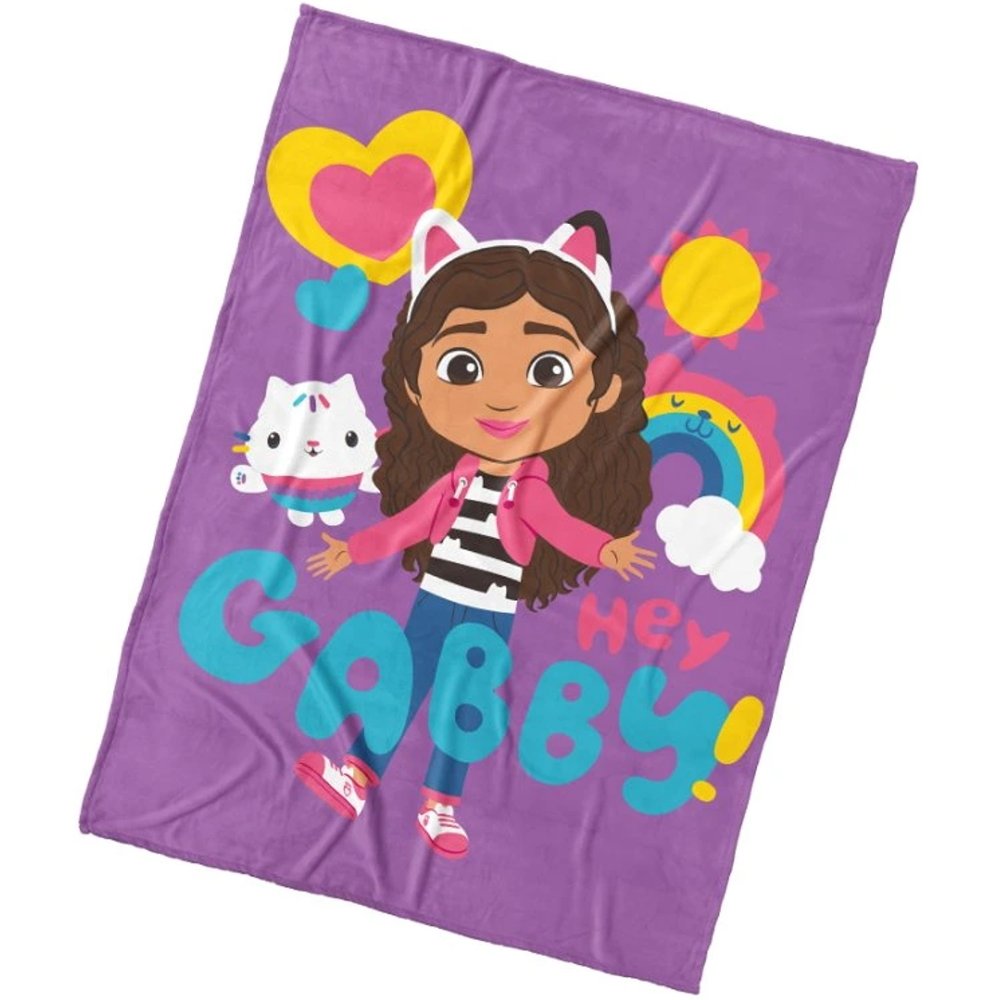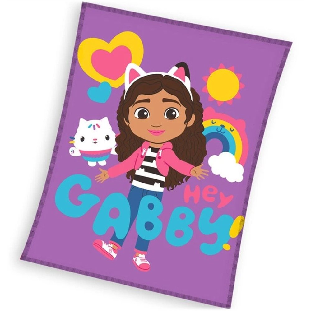 Viac o produkteTáto mäkučká plyšová deka Gabby's Dollhouse je skvelým doplnkom pre všetky malé slečny, ktoré majú rady Gábinu a jej kúzelný domček. Zdobí ju veselý motív dievčatka Gábinky s mačičkou Pandy Paws, farebnými srdiečkami, dúhou a nápisom Hey Gabby! na fialovom podklade. Je vyrobená z príjemného, chlpatého a mäkkého coral fleecu. Deka nájde široké využitie po celý rok – zahreje pri odpočinku, poslúži ako prehoz na posteľ a zútulní každú detskú izbičku. Aj po mnohých praniach si uchováva intenzívne farby. Jej rozmery sú 150 × 200 cm.