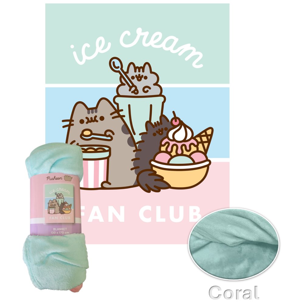 Mäkučká deka z korálového flísu s motívom Pusheen – Klub milovníkov zmrzliny poteší všetkých fanúšikov tejto roztomilej mačičky. Je hebká, hrejivá a ideálna na leňošenie doma aj na cestách. Jej farby zostávajú výrazné aj po mnohých praniach a jej rozmery sú 130 × 170 cm.