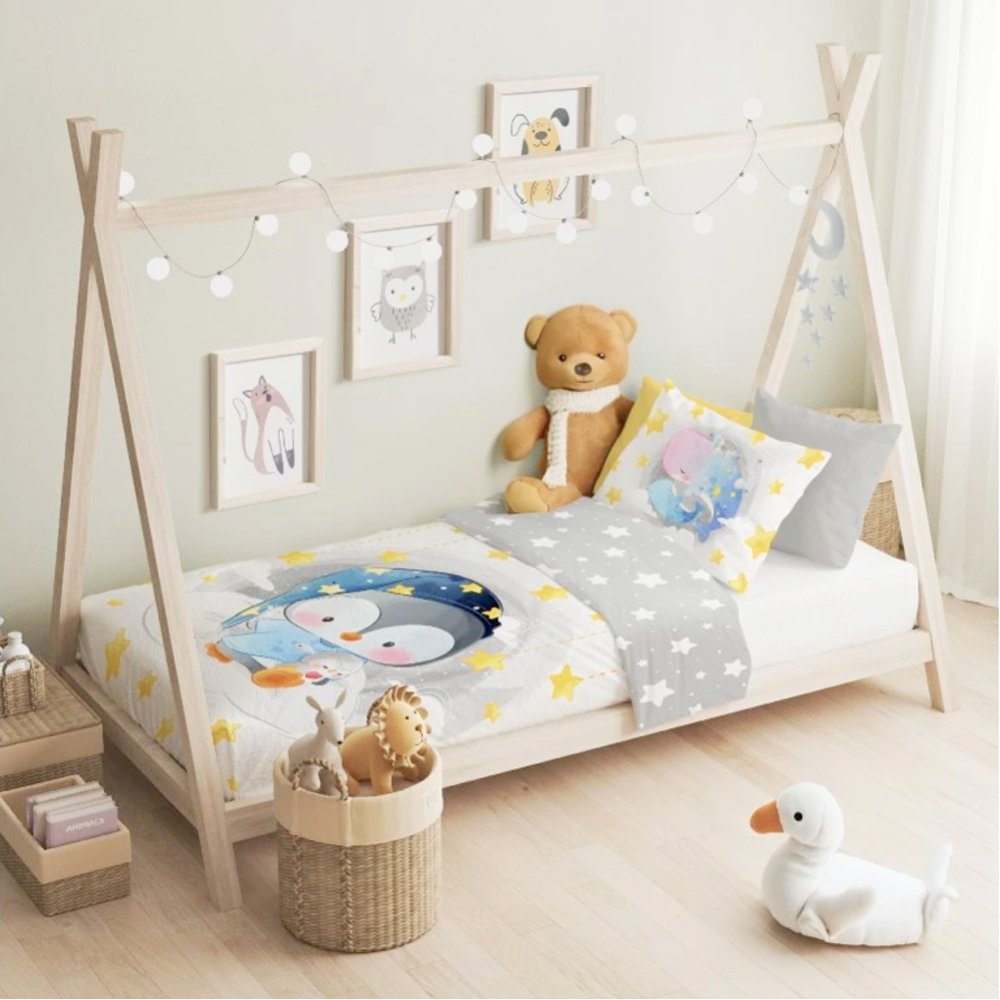 Viac o produkteTieto detské posteľné obliečky s tučniakom sú ideálne do malej detskej postieľky alebo kolísky. Na lícnej strane obliečky na prikrývku je rozkošný tučniak, ktorý sa chystá do postieľky, zatiaľ čo druhá strana je sivá s motívom bielych hviezdičiek. Obliečku na vankúš zdobí z oboch strán ilustrácia veľryby hrajúcej sa s mláďatkom.