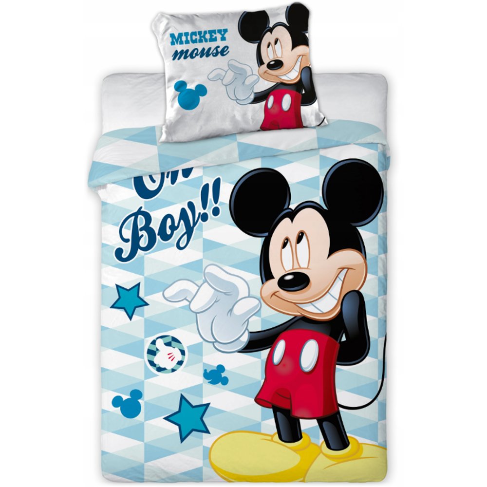 Posteľné obliečky Mickey Mouse do malej detskej postieľky alebo kolísky. Zdobí ich obrázok ikonického myšiačika Mickeyho zo štúdia Walt Disney. Súprava obsahuje obliečku na prikrývku 100×135 cm a obliečku na vankúš 40×60 cm.
