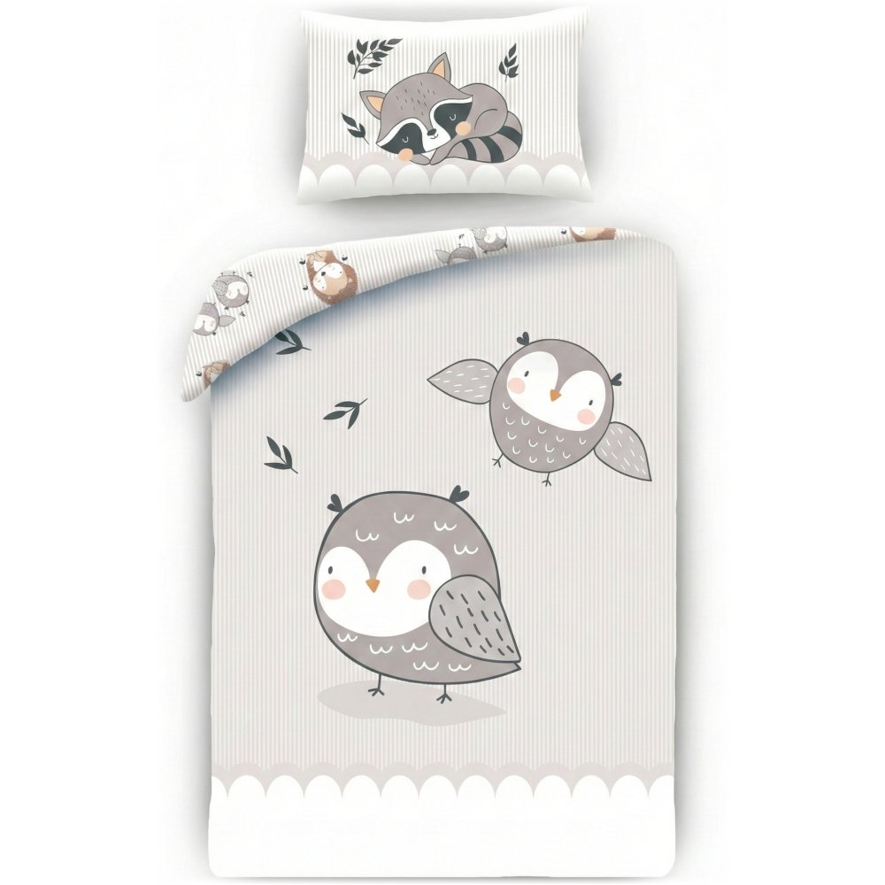 Viac o produkteTieto detské posteľné obliečky so sovičkami a mývalom sú ideálne do malej detskej postieľky alebo kolísky. Na lícnej strane obliečky na prikrývku dominujú roztomilé sovičky v jemných sivobéžových tónoch, ktoré dopĺňajú padajúce lístky. Druhá strana prikrývky je posiata drobným opakujúcim sa vzorom malých sovičiek na jemne prúžkovanom podklade. Obliečku na vankúš zdobí ilustrácia spiaceho mývala.