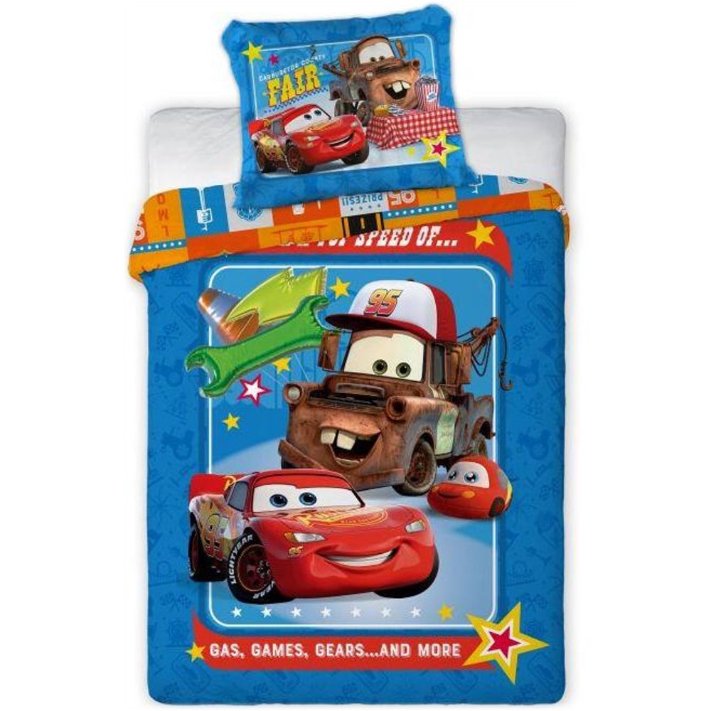 Lícnu stranu obliečky na prikrývku zdobí výrazný motív Buráka v šiltovke a Bleska McQueena na modrom podklade s farebnými detailmi, hviezdičkami a motívmi spojenými so svetom áut. Rubová strana prikrývky je ladená do modrej a oranžovej farby s drobnejším vzorom. Obliečka na vankúš je z oboch strán rovnaká a zobrazuje Bleska McQueena a Buráka na modrom podklade. Obliečky majú praktické zapínanie na zips pre jednoduché prezliekanie. Súprava obsahuje 1x obliečku na prikrývku 100 x 135 cm a 1x obliečku na vankúš 40 x 60 cm.