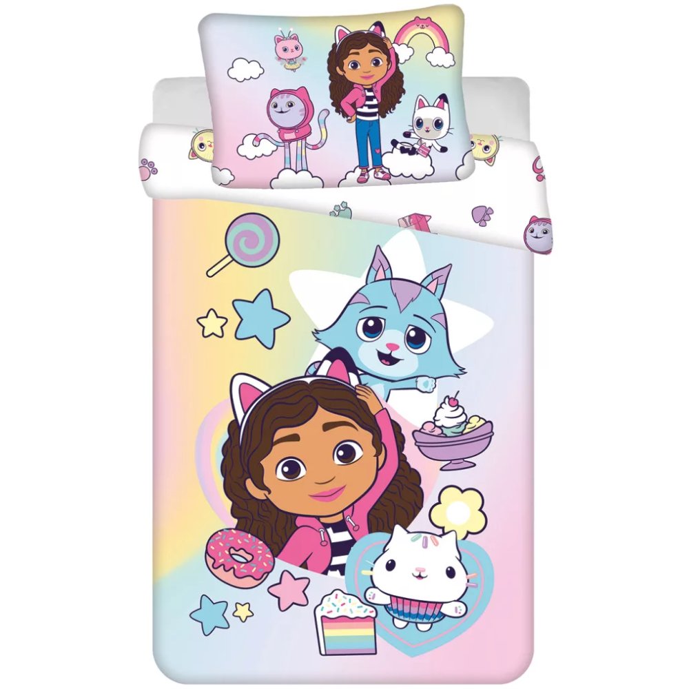 Lícnu stranu obliečky na prikrývku zdobí Gabinka so svojimi roztomilými mačacími kamarátmi na pastelovo ladenom podklade doplnenom sladkosťami, hviezdičkami a ďalšími hravými detailmi. Rubová strana prikrývky je svetlá a zdobia ju drobnejšie motívy postavičiek a obrázkov zo sveta Gábininho kúzelného domčeka. Obliečka na vankúš je z oboch strán rovnaká a zobrazuje Gabinku s mačacími kamarátmi medzi obláčikmi a dúhou. Obliečky majú praktické zapínanie na zips pre jednoduché prezliekanie. Súprava obsahuje 1x obliečku na prikrývku 100 x 135 cm a 1x obliečku na vankúš 40 x 60 cm.