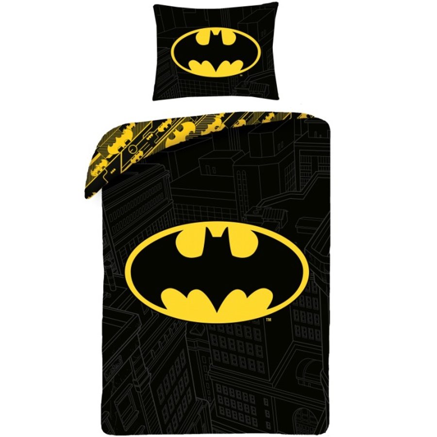 Posteľná súprava Batman - motív Logo. Tieto obojstranné posteľné obliečky sú vyrobené zo 100% bavlny so zapínaním na zips. Na lícnej strane obliečky na prikrývku a oboch stranách obliečky na vankúš je nočná silueta mesta Gotham a uprostred veľký znak Batmana s čiernym netopierom v žltom oválku. Druhá strana obliečky na perinu je tiež ladená do čiernej a žltej farby a tiež jej dominujú znaky Batmana so siluetou netopiera. Táto súprava posteľnej bielizne obsahuje 1x obliečku na prikrývku 140 x 200 cm a 1x obliečku na vankúš 70 x 90 cm.