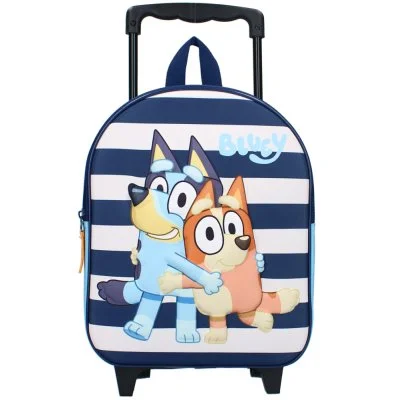 Detský cestovný kufrík Bluey s obrázkom Bluey a jej sestry Bingo na pruhovanom podklade. Ideálny ...