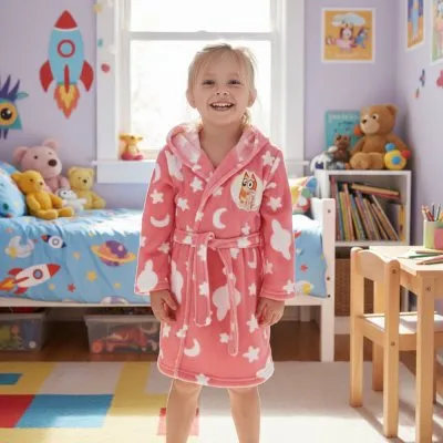 Detský župan Bluey s obrázkom mladšej a rovnako obľúbenej sestričky Bingo. Má kapucňu a opasok v ...