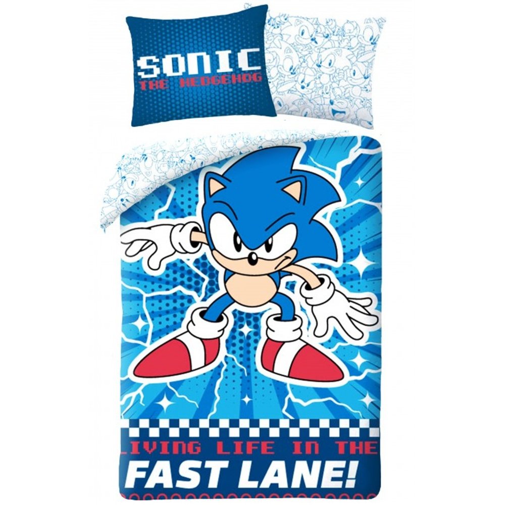 Posteľné obliečky Ježko Sonic s dynamickým motívom obľúbenej postavy z videohry. Lícnu stranu zdobí Sonic na modrom pozadí s bleskami a nápisom „Living life in the fast lane!“. Druhá strana je biela s drobnými kresbami Sonica. Vyrobené zo 100% bavlny, zapínanie na zips, rozmery 140 x 200 cm + 70 x 90 cm.