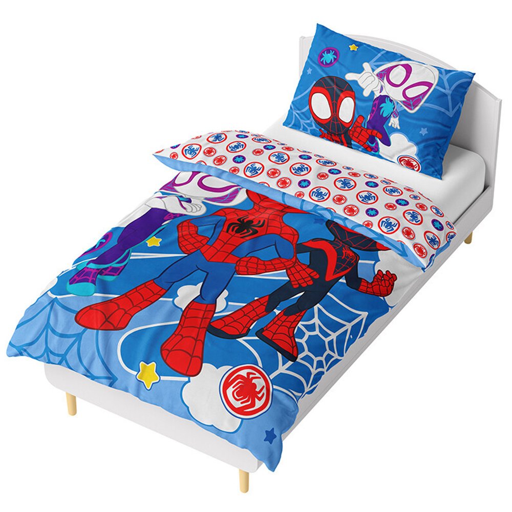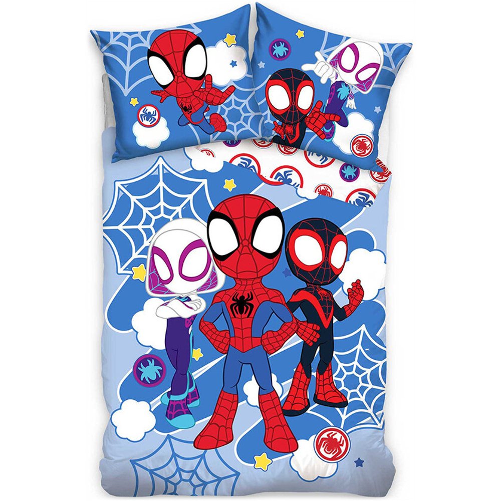 Hrejivé mikroplyšové obliečky Spidey a jeho úžasní priatelia potešia všetkých malých fanúšikov tohto animovaného seriálu. Na lícnej strane sú hrdinovia Spidey, Ghost Spider a Spin, na rube pavúčie odznaky. Jemný huňatý materiál je priedušný, udržuje teplo a zaistí deťom pohodlný spánok. Rozmery 140 x 200 cm + 70 x 90 cm.