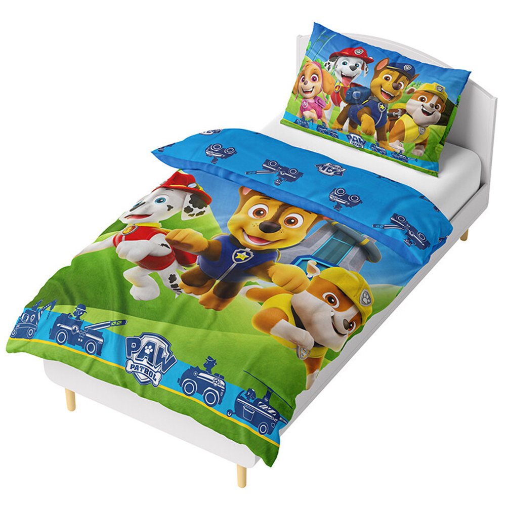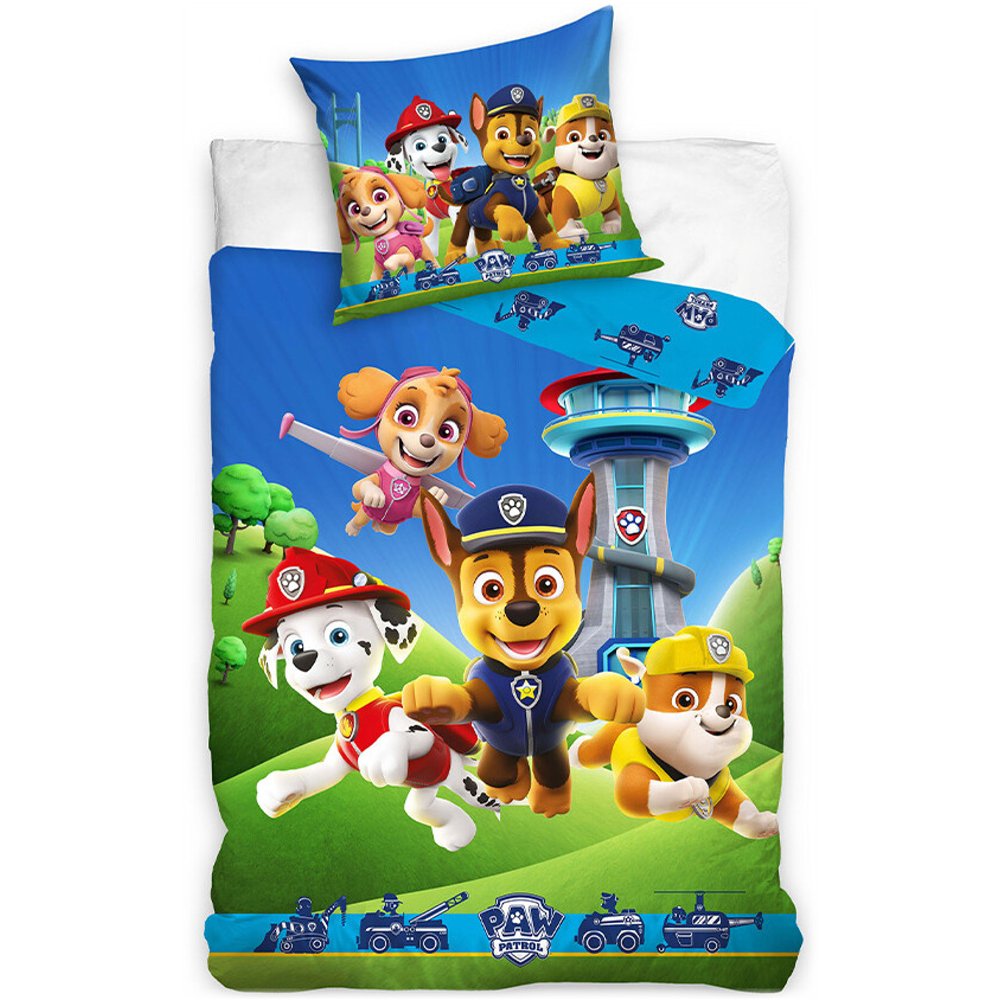 Hrejivé mikroplyšové obliečky Paw Patrol s motívom Bežíme do akcie potešia všetkých malých fanúšikov tohto animovaného seriálu. Na lícnej strane sú psí hrdinovia Marshall, Chase, Rubble a Skye, na rubovej strane symboly záchranárskych vozidiel. Jemný huňatý materiál je priedušný, udržuje teplo a zabezpečí deťom pohodlný spánok. Rozmery 140 x 200 cm + 70 x 90 cm.