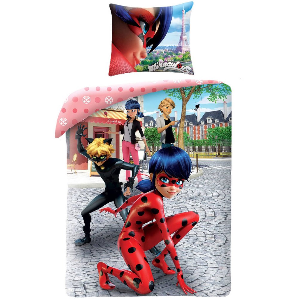 Posteľné obliečky Miraculous Ladybug and Cat Noir (Kúzelná lienka a Čierny kocúr) s motívom obľúbených rovnomenných hrdinov. Vyrobené z jemného mikrovlákna so zapínaním na zips. Sada obsahuje 1x povlak na prikrývku 140 x 200 cm a 1x povlak vankúš 70 x 90 cm. Certifikácia OEKO-TEX zaručuje kvalitu a nezávadnosť.