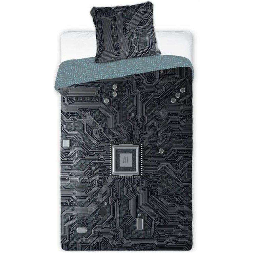 Obojstranné bavlnené obliečky s motívom AI Technológia a so svetielkujúcim efektom. Rozmer 140 × 200 cm + 70 × 90 cm, zapínanie na zips. Certifikácia MADE IN GREEN by OEKO-TEX®.