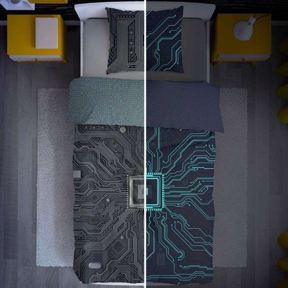 Viac o produkteSúprava posteľných obliečok s futuristickým motívom plošného spoja s procesorom uprostred zaujme nielen fanúšikov technológií. Na lícnej strane prikrývky aj vankúša sa po nasvietení denným svetlom zvýraznia silnejšie dátové cesty, ktoré po zotmení svietia a vytvárajú efekt oživenej umelej inteligencie. Druhá strana ponúka decentnejšiu verziu so šedozeleným podkladom a bielymi spojmi, ktorá nesvieti. Obliečky sú ušité zo 100% bavlny a vybavené praktickým zapínaním na zips. Svetielkujúci efekt sa po približne piatich praniach môže začať vytrácať. Rozmery súpravy sú 140 × 200 cm a 70 × 90 cm.