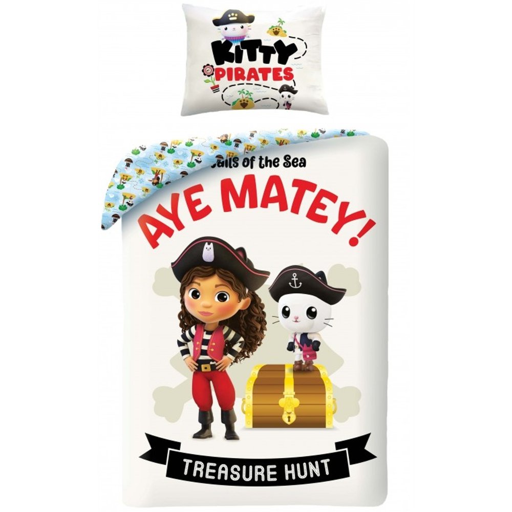 Posteľné obliečky Gábinin kúzelný domček s motívom Pirátky potešia všetky fanúšičky. Na lícnej strane prikrývky je obrázok Gabby a Pandy Paws v pirátskom prevleku, druhá strana je modrá ako more s malými ostrovčekmi, na ktorých sú Gábi, alebo jej kamarátky. Vankúš je z oboch strán rovnaký. Vyrobené zo 100% bavlny, zapínanie na zips, rozmery 140 x 200 cm + 70 x 90 cm.