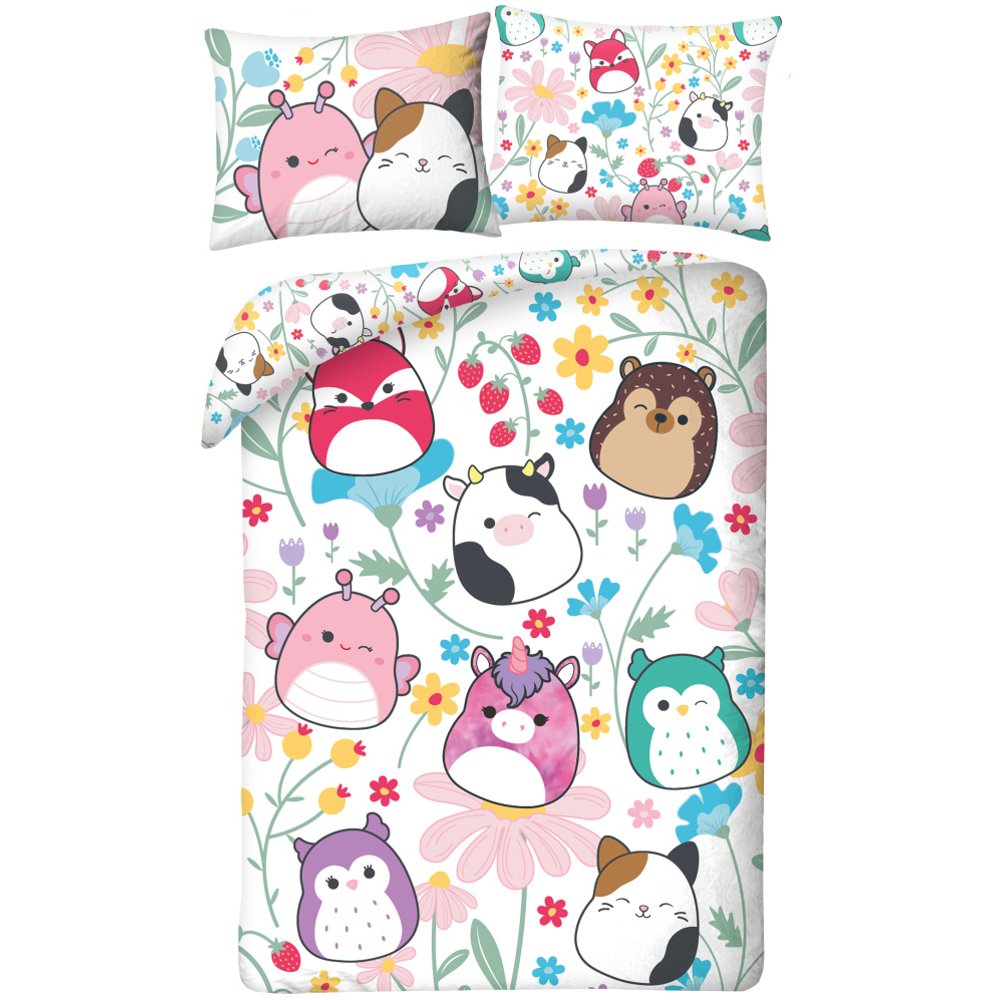 Súprava posteľných obliečok Squishmallows – motív Flower Friends. Je vyrobená z jemného polyesterového mikrovlákna. Táto tkanina je mäkká, hladká na dotyk a výborne odvádza vlhkosť. Rozmery 140×200 cm a 70×90 cm, zapínanie na zips.