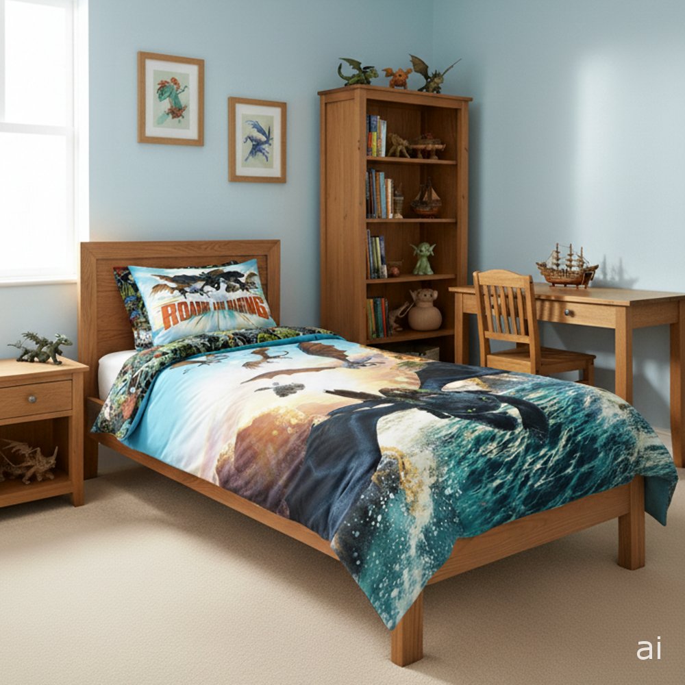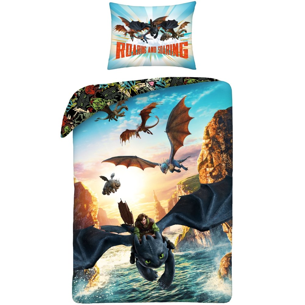 Súprava posteľných obliečok Ako si vycvičiť draka – motív Roaring and Soaring. Je vyrobená z jemného polyesterového mikrovlákna. Táto tkanina je mäkká, hladká na dotyk a výborne odvádza vlhkosť. Rozmery 140×200 cm a 70×90 cm, zapínanie na zips.
