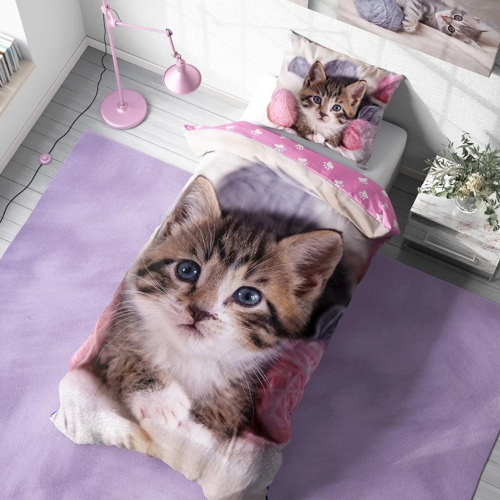 Viac o produkteTieto obliečky s motívom rozkošného mačiatka potešia všetkých milovníkov mačiek. Na lícnej strane poťahu na prikrývku aj na oboch stranách poťahu na vankúš je obrázok mačiatka ležiaceho medzi klbkami ružovej vlny. Rubová strana prikrývky je ružová s bielymi odtlačkami mačacích labiek.