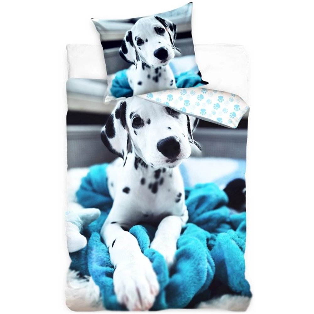 Viac o produkteObliečky s motívom roztomilého Dalmatina potešia všetkých milovníkov psov. Na lícnej strane obliečky na prikrývku aj na oboch stranách obliečky na vankúš je obrázok roztomilého šteňaťa ležiaceho na modrej deke. Rubová strana prikrývky je biela s modrými odtlačkami psích labiek.
