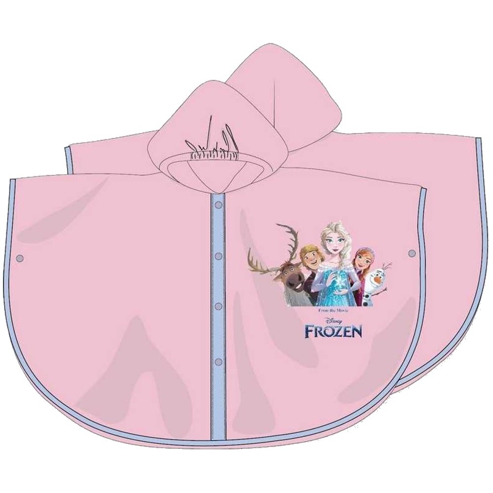 Detské pončo do dažďa Ľadové kráľovstvo - Frozen - s kapucňou a obrázkom obľúbených postáv - princezien Anny a Elsy, Kristoffa, snehuliaka Olafa a soba Svena. Vyrobené z mäkkého a pevného PVC, so zapínaním na cvoky pre ľahké obliekanie. Dostupné vo veľkostiach 98, 104, 116 a 128.